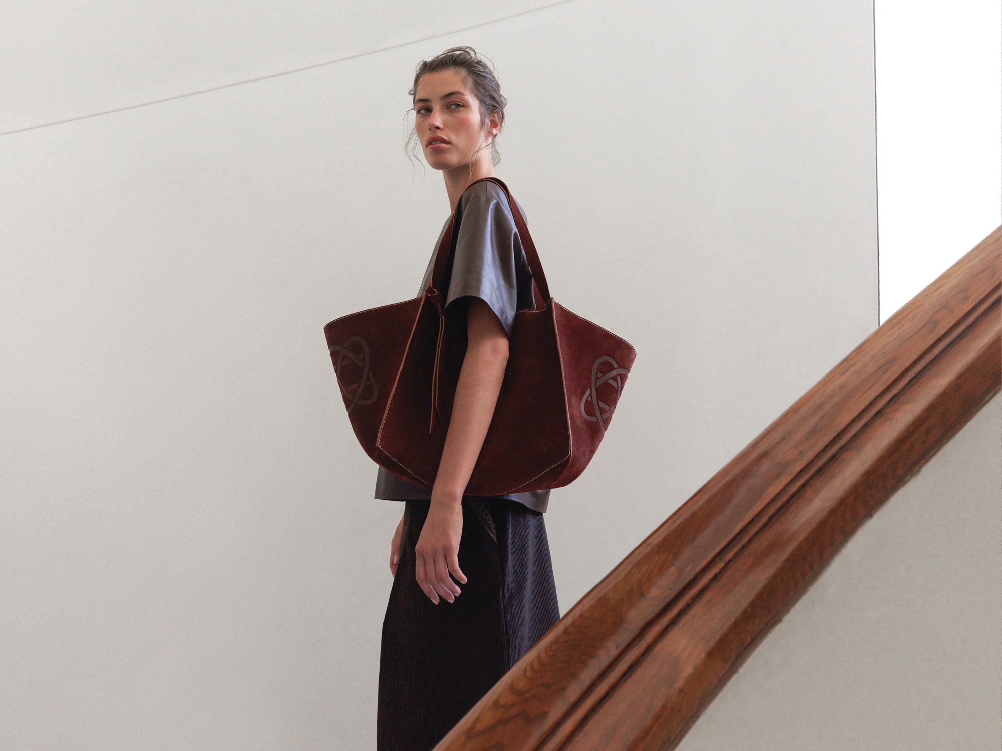- Η νέα μεγάλη tote, σε καφέ σουέντ ή μαύρο λείο δέρμα, είναι αφαιρετική και δυναμική.