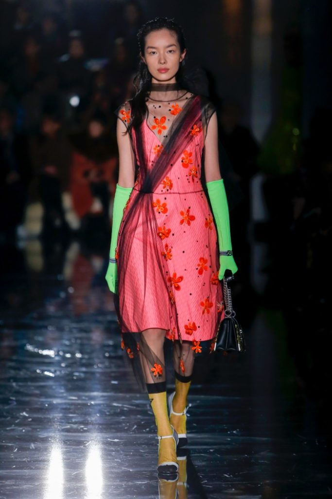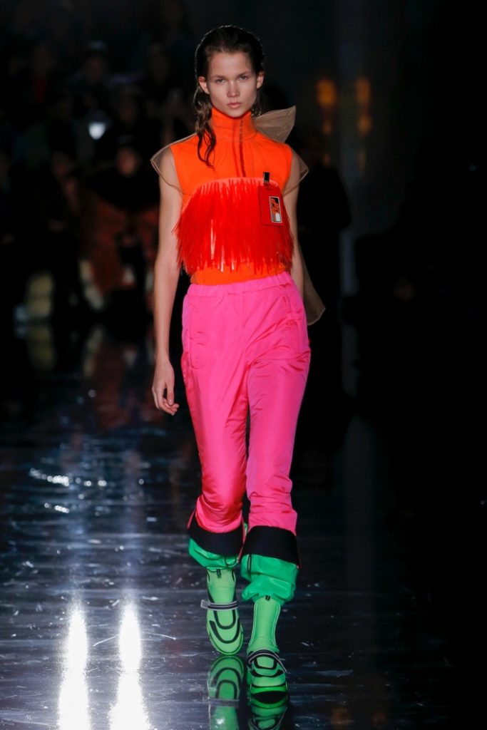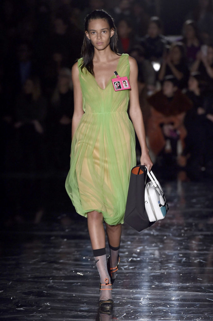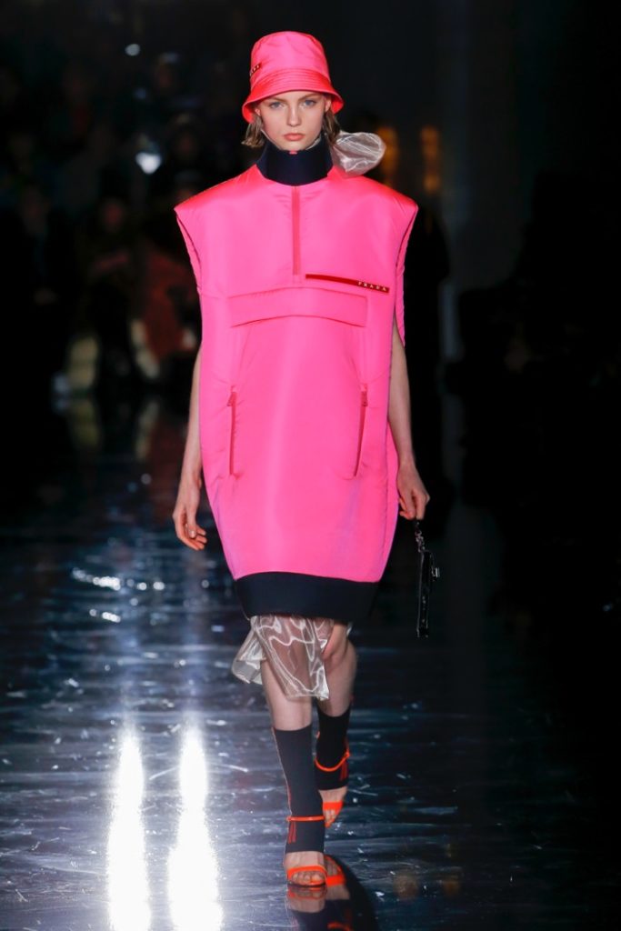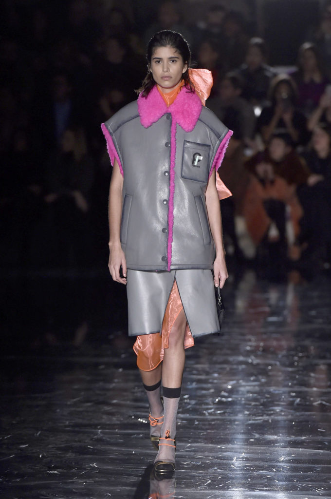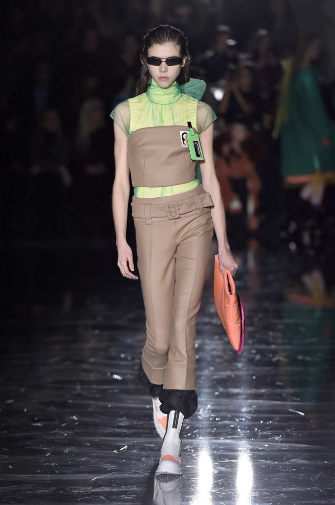 Η Prada για τη σεζόν φθινόπωρο-χειμώνας 2018 θέλει να ντύσει τις γυναίκες “που βγαίνουν στη βία” – δίνοντάς τους μια εμφάνιση για να «βγουν έξω στο δρόμο και να μην φοβούνται». Αυτό μεταφράστηκε σε τολμηρές νέον αποχρώσεις με το μαύρο να μοιάζει αντιμέτωπο με μια ζωντανή παλέτα. Υπερμεγέθη παλτά που συνδυάστηκαν με θηλυκά φορέματα και διάφανα στρώματα από τούλι δημιούργησαν δυνατά σύνολα ενώ η παλέτα χρωμάτων περιλάμβανε πράσινες, ροζ, πορτοκαλί, πράσινες και κίτρινες αποχρώσεις. Για την ώρα των κοκτέιλ, η γυναίκα Prada φοράει fit and flare φλοράλ φορέματα ενώ όταν οι θερμοκρασίες πέφτουν, τα τολμηρά πλεκτά ή τα αμάνικα γιλέκα προσθέτουν sporty αίσθηση στο look.
