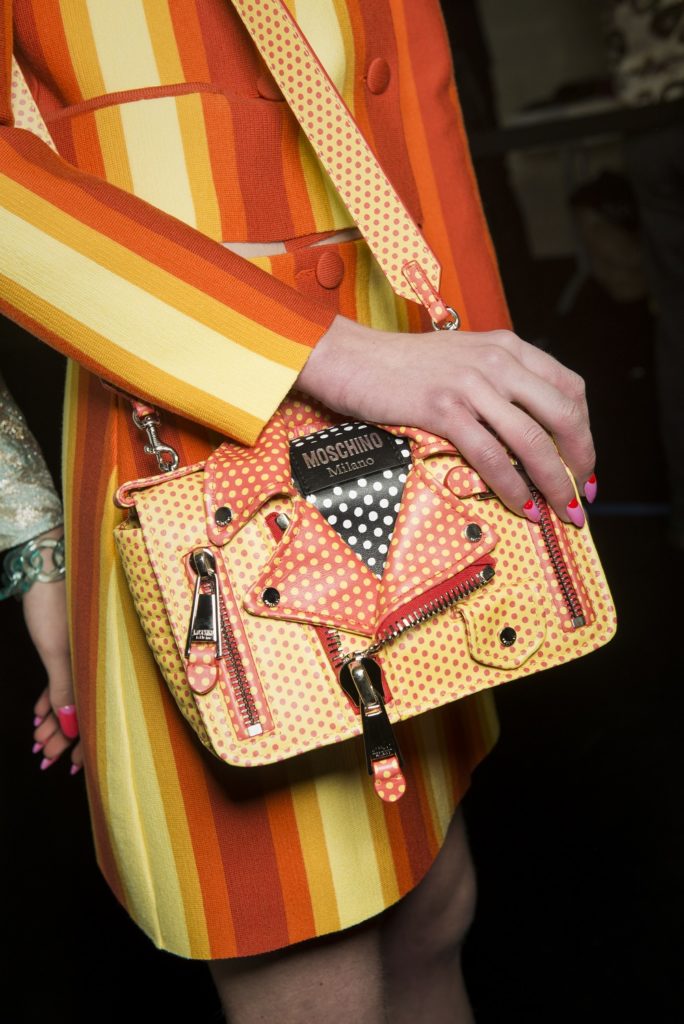 Στο άνοιγμα της επίδειξης ήταν η Kaia Gerber, και την ακολούθησαν οι Gigi και Bella Hadid, Joan Smalls και Stella Maxwell. Χαρακτηριστικά πολύχρωμη, η καινούρια συλλογή Moschino περιελάμβανε τολμηρά πορτοκαλί, μωβ και κίτρινα χρώματα σε μια ποικιλία από τουίντ σύνολα και δερμάτινα παλτό.