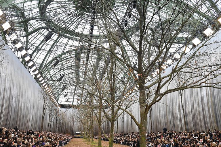 Λαμβάνοντας την εποχή σοβαρά υπόψη, η Chanel αγκάλιασε το φθινόπωρο με κάθε δυνατό τρόπο – από τις καλυμμένες με φύλλα προσκλήσεις μέχρι την πασαρέλα που διέσχισαν τα μοντέλα. Ο Karl Lagerfeld μετέτρεψε το Grand Palais του Παρισιού σε ένα ζωντανό δάσος γεμάτο με ψηλά δέντρα με ένα σκηνικό που φαινόταν να εκτείνεται μέχρι πολύ μακριά.