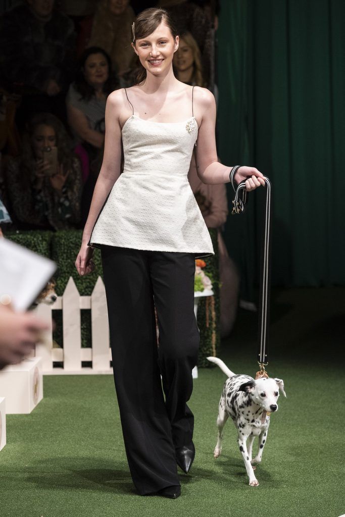 Ως επί το πλείστον, τα σύνολα κολάκευαν τα σκυλάκια τα οποία συνόδευαν τα μοντέλα στην πασαρέλα. Ένα Πουντλ συνδυάστηκε με ένα κομψό ασπρόμαυρο κοκτέιλ φόρεμα, ένα Κόργκι με ένα καρό, κι ένα Μπασέ Χάουντ με ένα floral look.