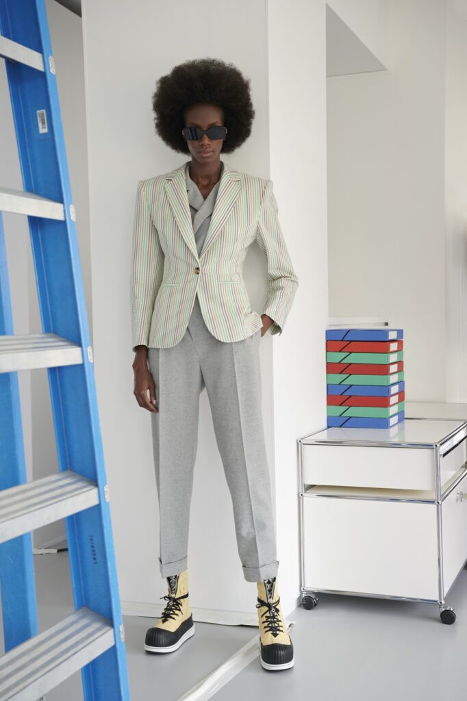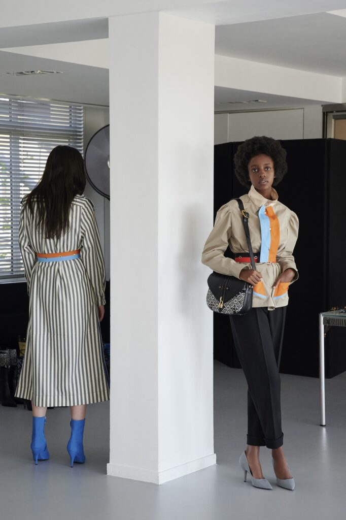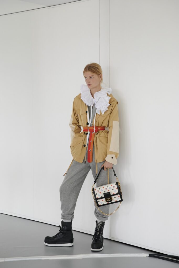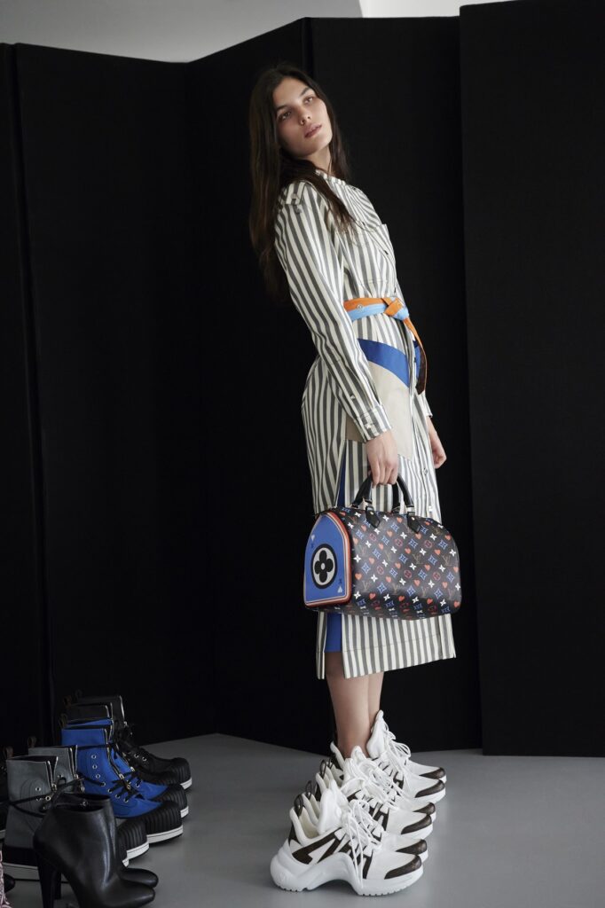 Μια διαφορετική γκάμα χρωμάτων εμφανίζεται σε όλη τη συλλογή, συμπεριλαμβανομένου ενός κόκκινου, μαύρου και λευκού ριγέ παντελονιού σε συνδυασμό με ένα μπεζ παλτό, και μια πολύχρωμη Monogram τσάντα. Το μοτίβο στην τσάντα συμπληρώνεται από τα σύμβολα της τράπουλας, ενώ παρόμοια μοτίβα βρίσκονται σε όλη τη γκάμα των αξεσουάρ. Μια δυναμική επιλογή υποδημάτων ολοκληρώνει τα σύνολα, με μπότες μεσαίου μήκους, γόβες και τα διάσημα Archlight αθλητικά του οίκου.