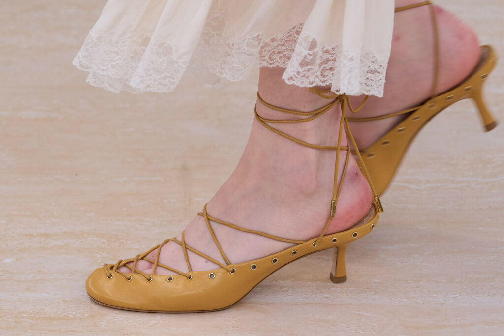 Πέρα όμως από τους αστραγάλους, κορδόνια δέθηκαν και στο μπροστινό μέρος αρκετών mules, ενώ μερικά από τα πιο χαρακτηριστικά σχέδια ξεχώρισαν στους οίκους Dries Van Noten και Chloé. Πιο συγκεκριμένα, στον πρώτο είδαμε wedge mules σε εξωτικό snake skin μοτίβο, ενώ η καλλιτεχνική διευθύντρια του οίκου Chloé Χιμένα Καμάλι παρουσίασε την πιο ρομαντική εκδοχή τους σε λευκό, μαύρο και στο χρώμα της πούδρας mules με χαμηλό τακούνι, τα οποία συνδύασε με τις ανάλαφρες, ονειρεμένες δημιουργίες της.