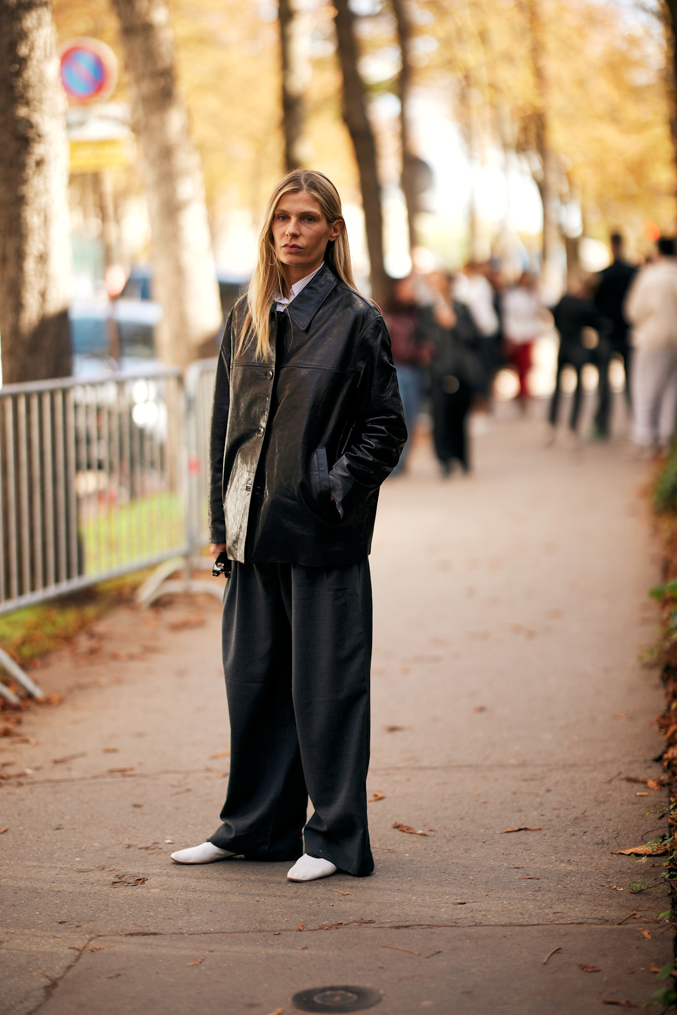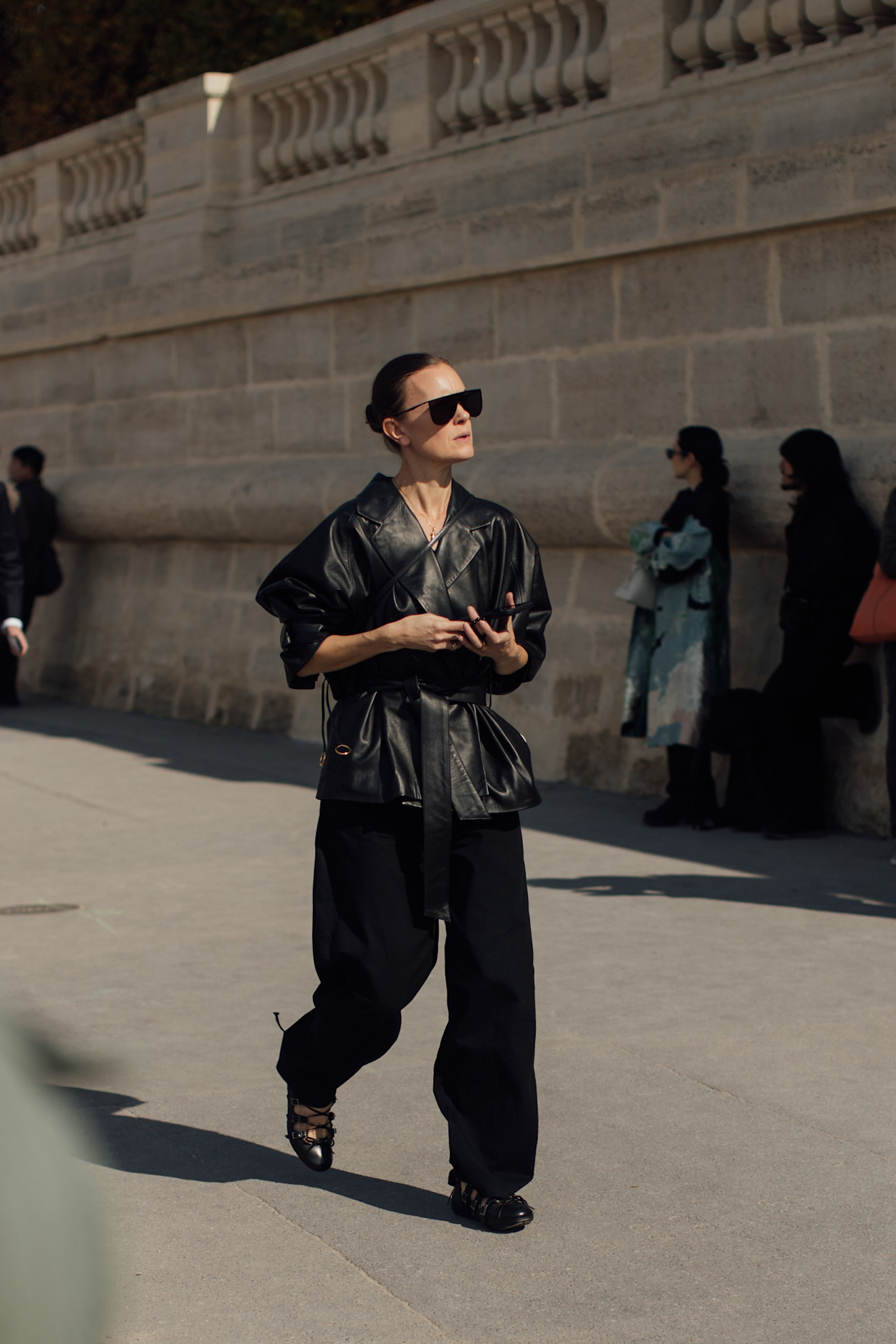Εναλλακτικά, δοκιμάστε ένα δερμάτινο τζάκετ τονισμένο στη μέση με ζώνη, ένα φαρδύ παντελόνι και μπαλαρίνες ή μοκασίνια: είναι ο τέλειος συνδυασμός για τις μέρες που ο καιρός έχει αρχίσει να γίνεται πιο δροσερός.