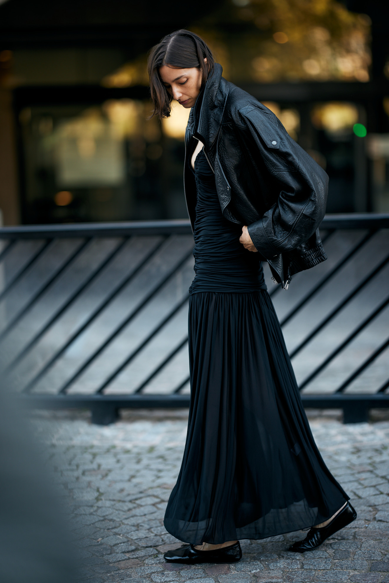 Προσθέστε χαρακτήρα σε μια βραδινή εμφάνιση, συνδυάζοντας ένα maxi φόρεμα με ένα άνετο δερμάτινο jacket και μπαλαρίνες ενισχυμένες με ένα διάφανο καλσόν.