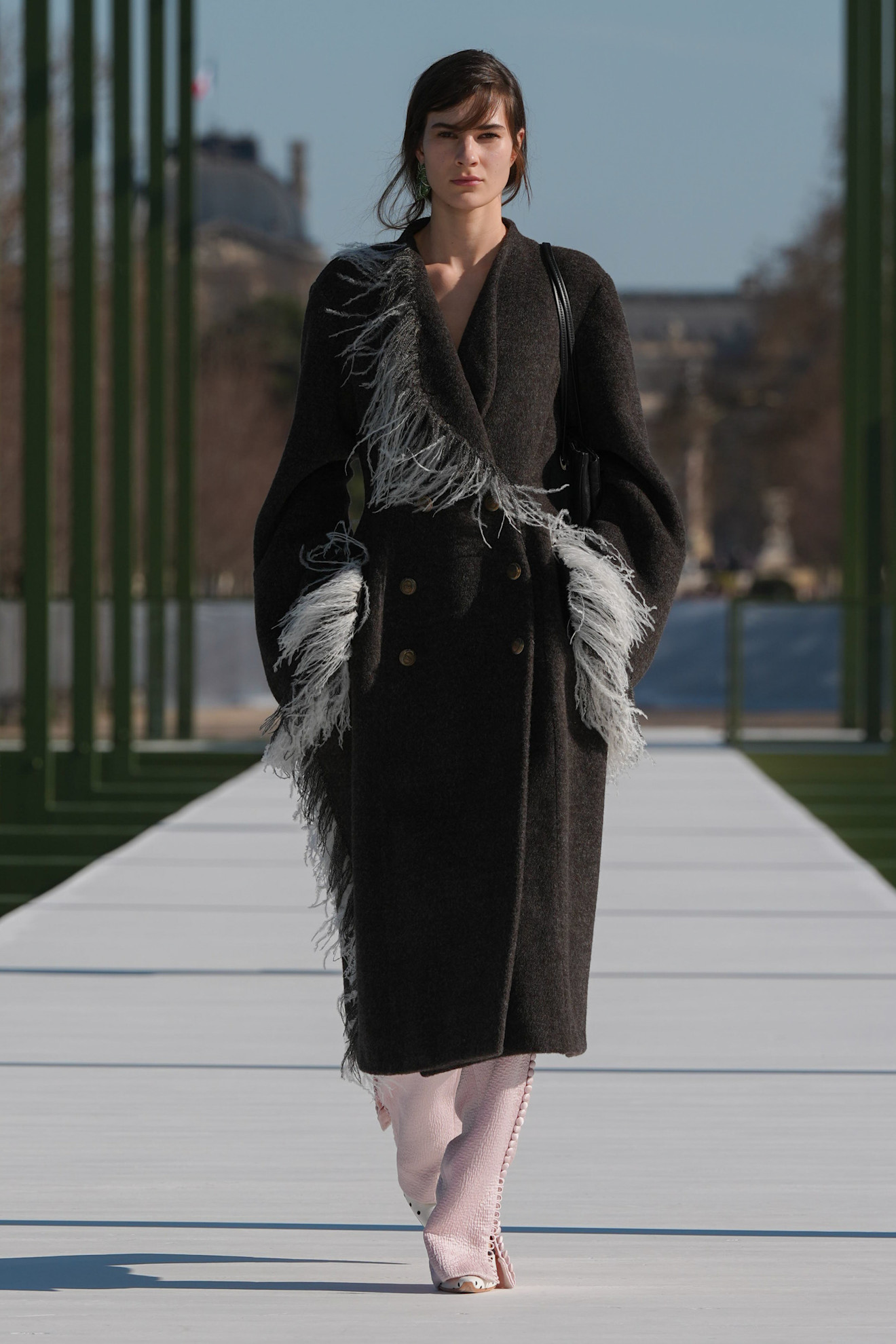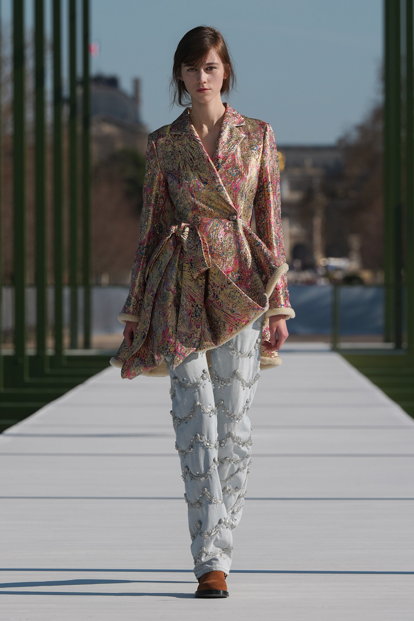 Ακόμη και τα πιο απλά κομμάτια είχαν μια δόση φαντασίας: τζιν με κεντημένες παγιέτες, παλτό με διάσπαρτα φτερά σαν να αιωρούνται, γκρι κοστούμια με διακριτική λάμψη, φόρμες με παιχνιδιάρικα μοτίβα. Σε άλλες περιπτώσεις, η έμπνευση ήταν πιο άμεση: λουλούδια προσαρτημένα σε φορέματα, πράσινα τακούνια με μοτίβο νούφαρου, δημιουργίες που έμοιαζαν να ανθίζουν πάνω στο σώμα.