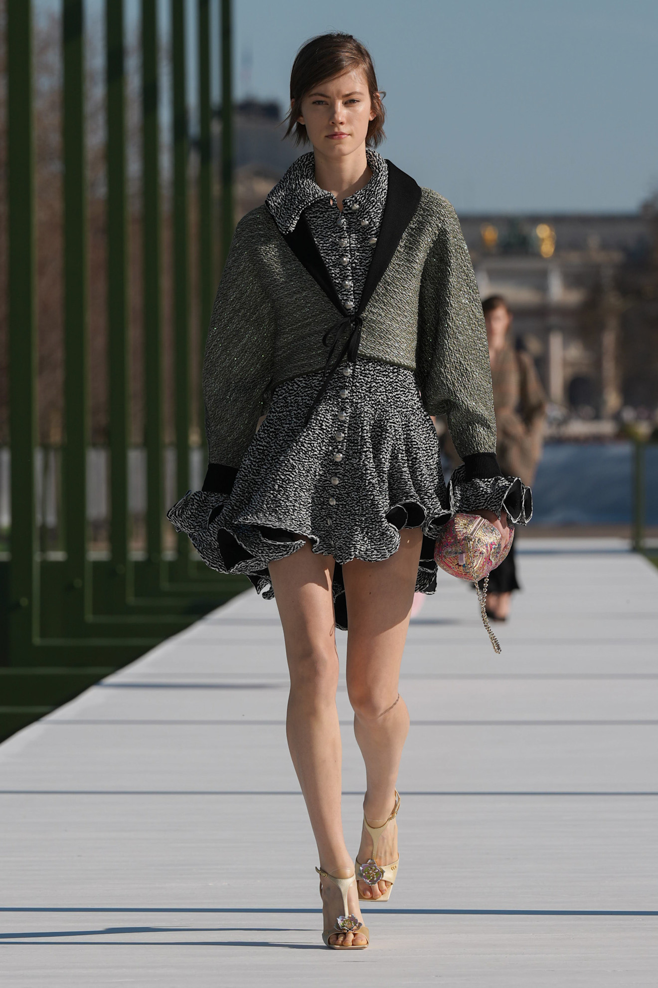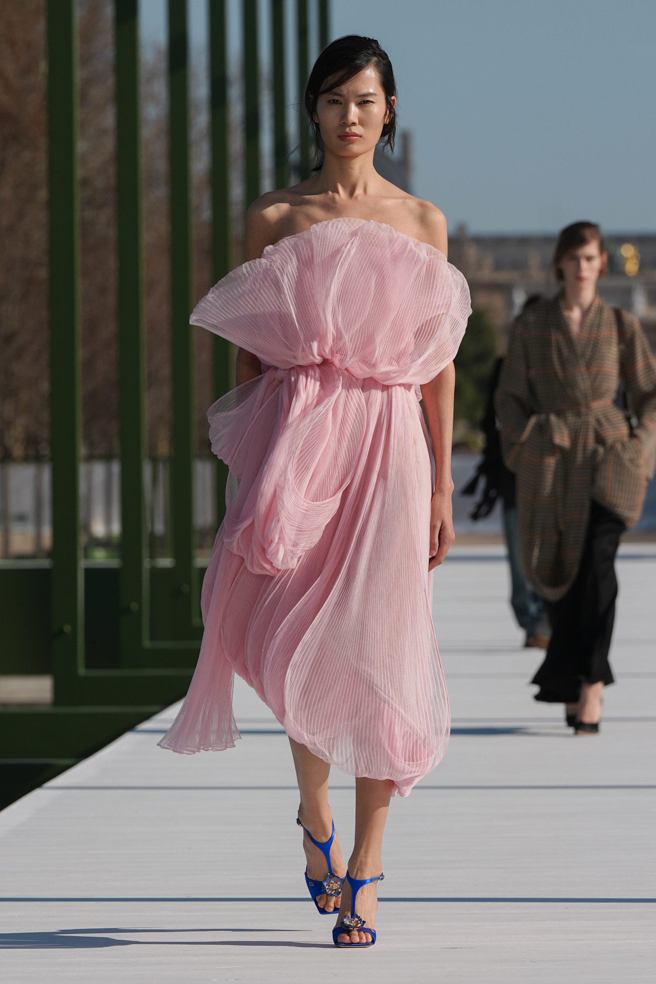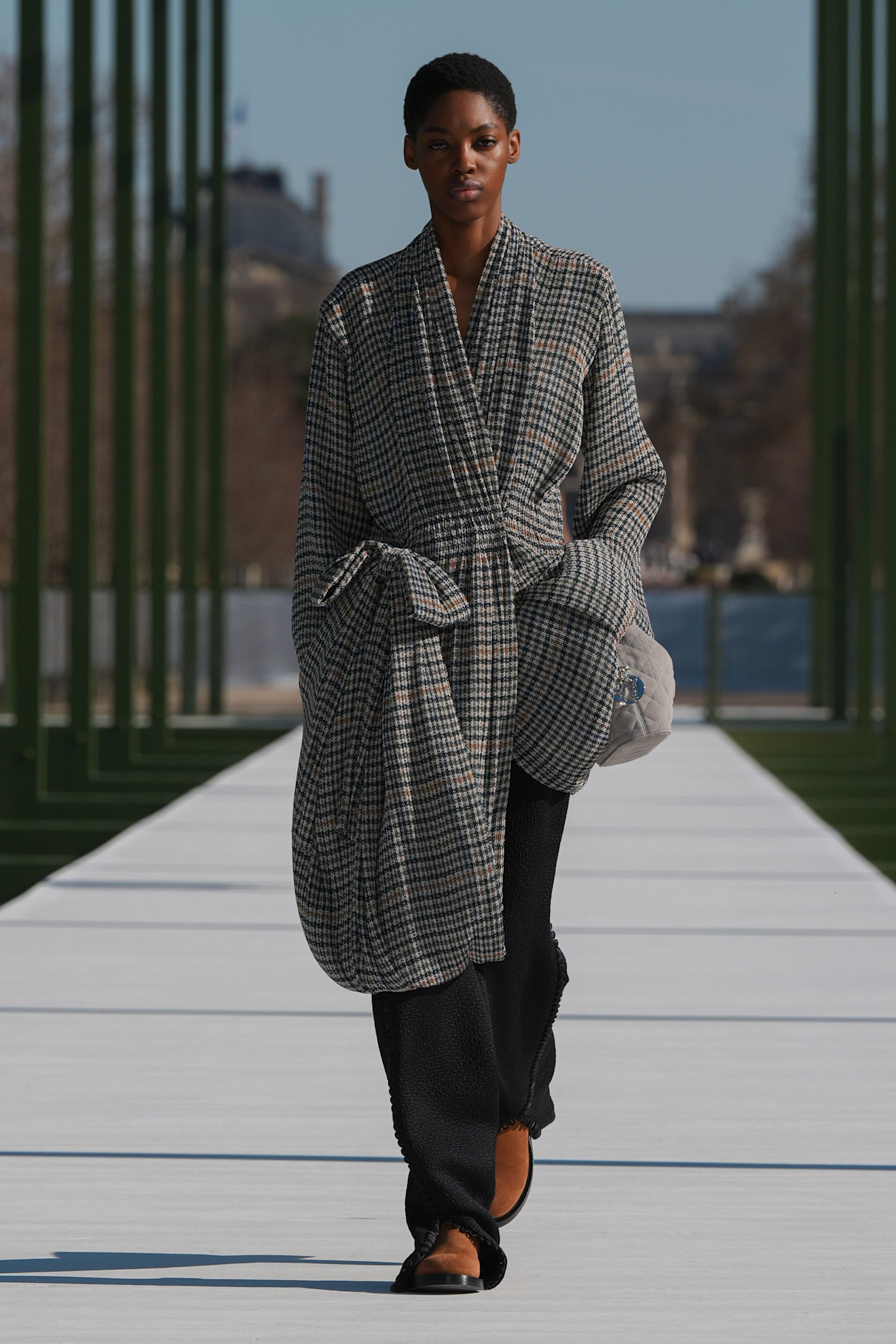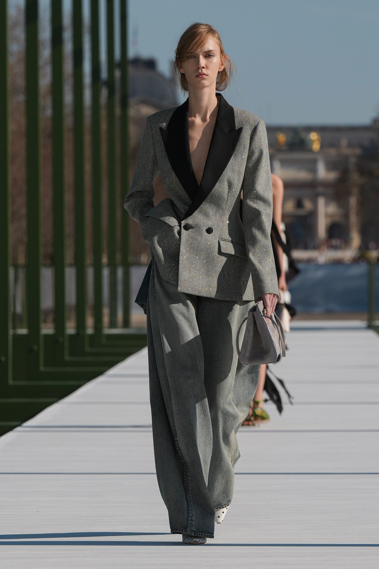 Όσο για τα αξεσουάρ, ήταν όπως πάντα αξιομνημόνευτα: clutch σε σχήμα φυστικιού, σκουλαρίκια που παρέπεμπαν σε φύλλα νούφαρου, Lady Dior με κοντά χερούλια και tote διακοσμημένες με μικροσκοπικούς φιόγκους, αλλά και πουά γόβες, όλα φτιαγμένα για μια κομψή βόλτα στο παριζιάνικο φως.