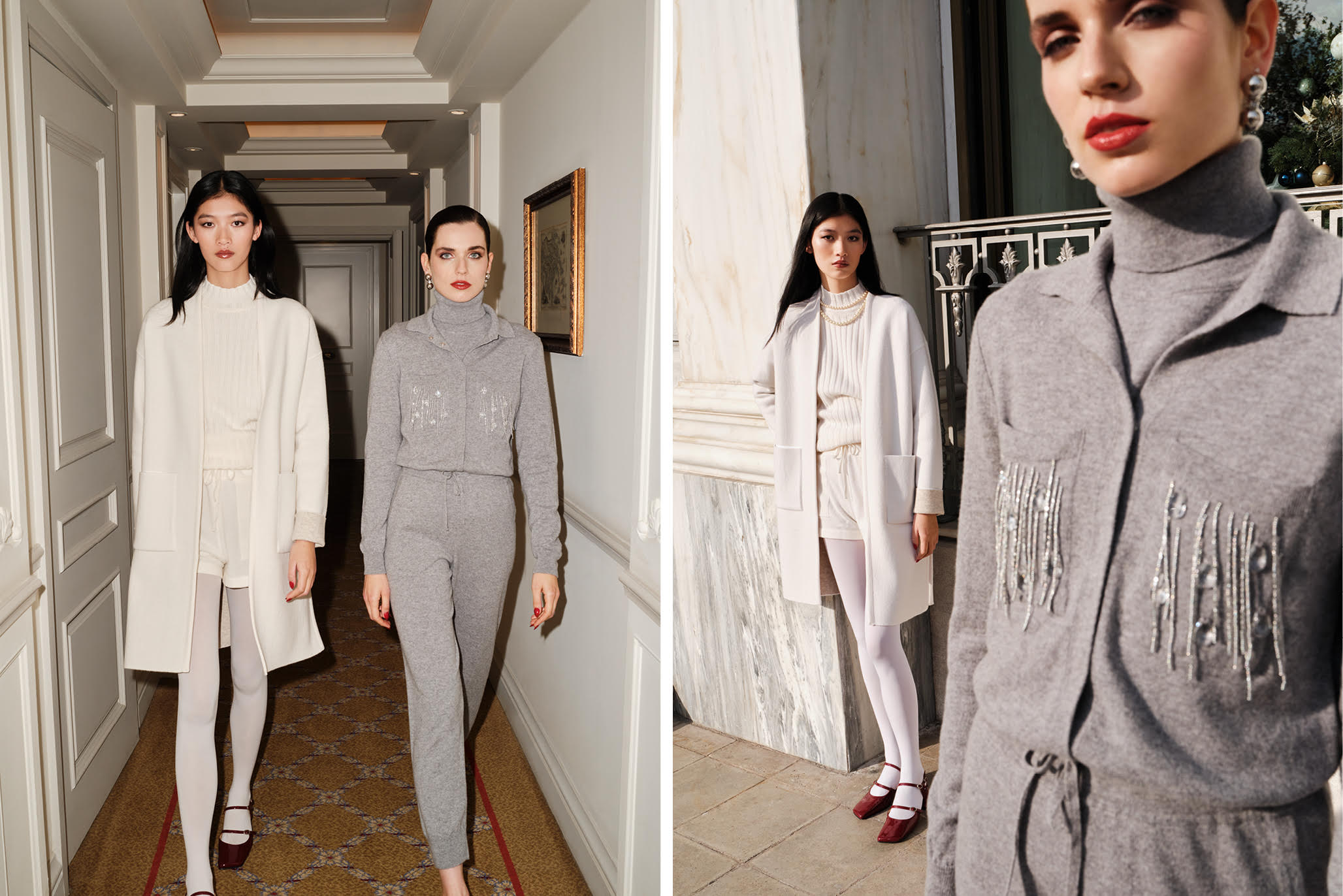 Στη νέα κολεξιόν, εκλεπτυσμένα κομμάτια της γκαρνταρόμπας, όπως απαλά πουλόβερ από κασμίρ, παντελόνια και ολόσωμες φόρμες στολίζονται με λεπτές αστραφτερές απλίκες σε μια χρωματική παλέτα που κυμαίνεται από το διαχρονικό γκρι, το μαύρο και το μπλε έως το φωτεινό snowflake.