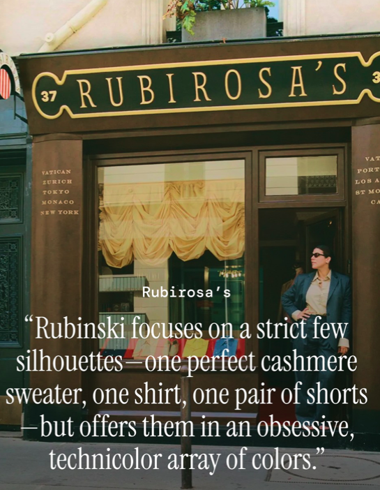 Το Rubirosas δεν αποτελεί ούτε αποσκοπεί να γίνει ένα brand μόδας ή κατάστημα που φιλοξενεί τις τάσεις. «Κάθε μαγαζί έχει μαύρο, ναυτικό μπλε και ριγέ και αυτό είναι. Ο κόσμος έχει κουραστεί» λέει εξηγώντας εν μέρει την μεγάλη αποδοχή που έχει από νωρίς λάβει το κατάστημα της, γνωστό κυρίως για τα πουκάμισα του σε πολλά και διαφορετικά χρώματα, τα κασμιρένια πουλόβερ, τις πιτζάμες και τα boxer shorts. Οι αποχρώσεις που κυμαίνονται από απαλό πράσινο στο χρώμα της μέντας μέχρι βαθιά κόκκινα λειτουργούν σαν μια δόση χρωματικής ντοπαμίνης όχι μόνο για όσους φοράνε τα κομμάτια, αλλά και για όσους μπαίνουν στο απλό αλλά κομψό μαγαζί.