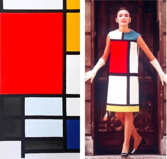 Το φόρεμα που παρουσίασε ο Yves Saint Laurent το 1965, αποτελεί ίσως την γνωστότερη δημιουργία όπου η τέχνη και η μόδα τόσο άμεσα διασταυρώθηκαν. Ακολουθώντας την αισθητική σχολή του μοντερνισμού, ο γάλλος σχεδιαστής αποτύπωσε σχέδια του Piet Mondrian σαν το “Composition with Yellow, Red, Blue, and Gray” με σιλουέτα που παρέμενε σε ίσια γραμμή αντί να αγκαλιάζει το σώμα, προκειμένου να μη χαθούν τα σχήματα και τα χρώματα του καλλιτεχνικού έργου. Σίγουρα δεν ήταν ένα απλό cocktail dress.