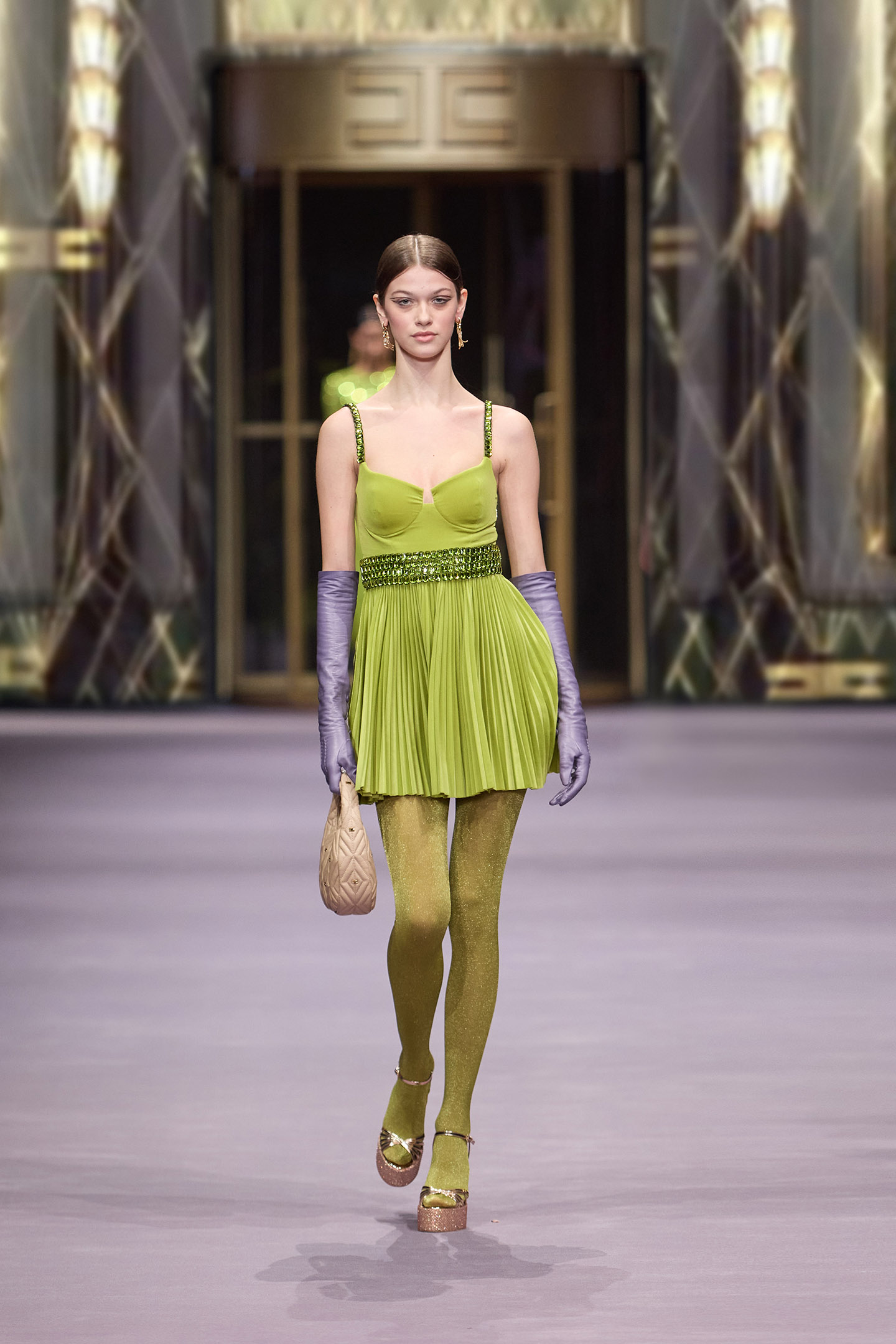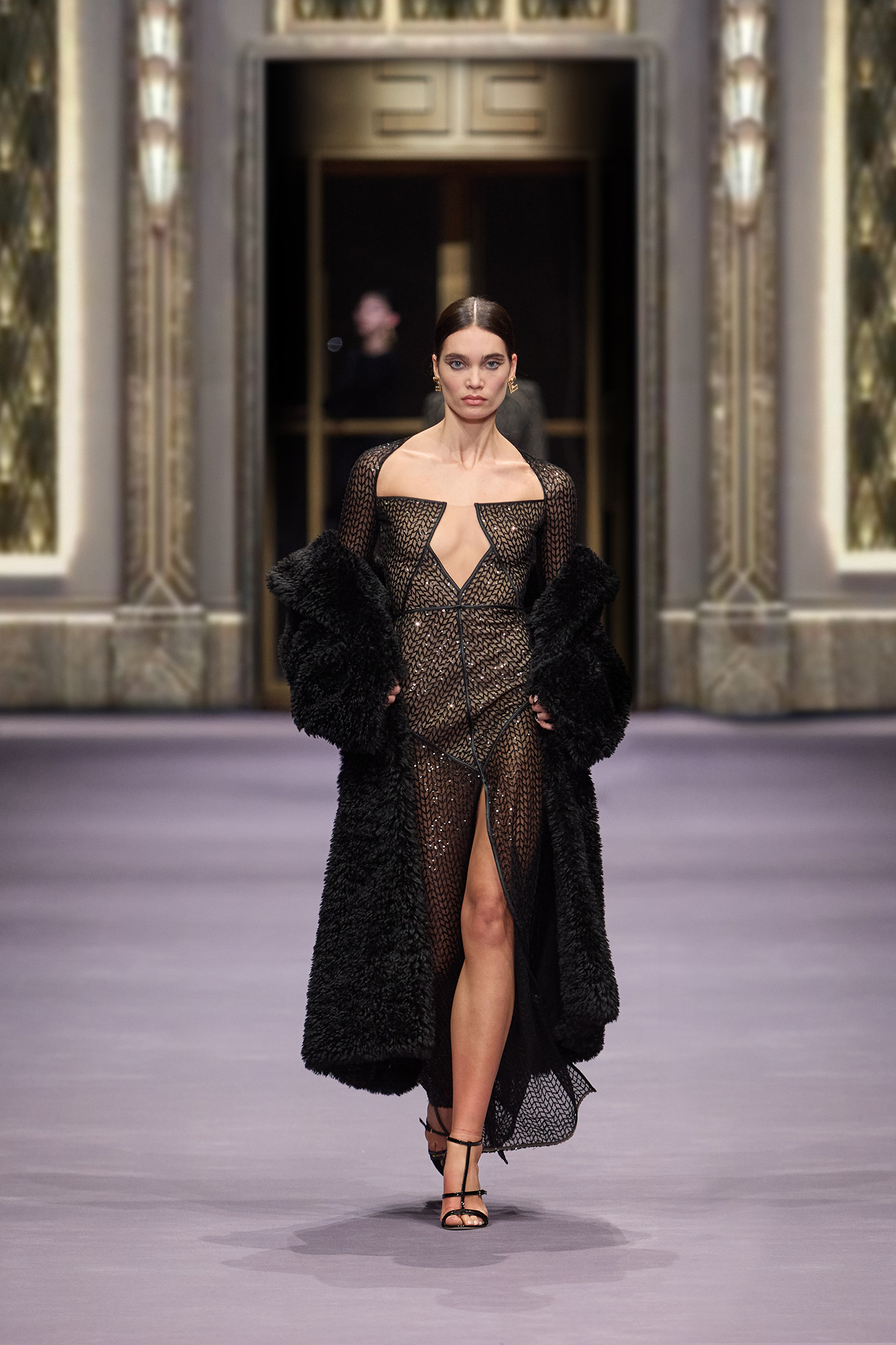 Τα υλικά τυλίγονται γύρω από τη σιλουέτα, που κυμαίνεται από αισθησιακά εφαρμοστά κοψίματα, έως πιο απαλές γραμμές, ειδικά στη μέση. Ένθετα και λεπτομέρειες από δαντέλα που κλείνουν το μάτι στα εσώρουχα, συνοδεύονται από βαθιά ντεκολτέ που παραπέμπουν σε έναν εκλεπτυσμένο και