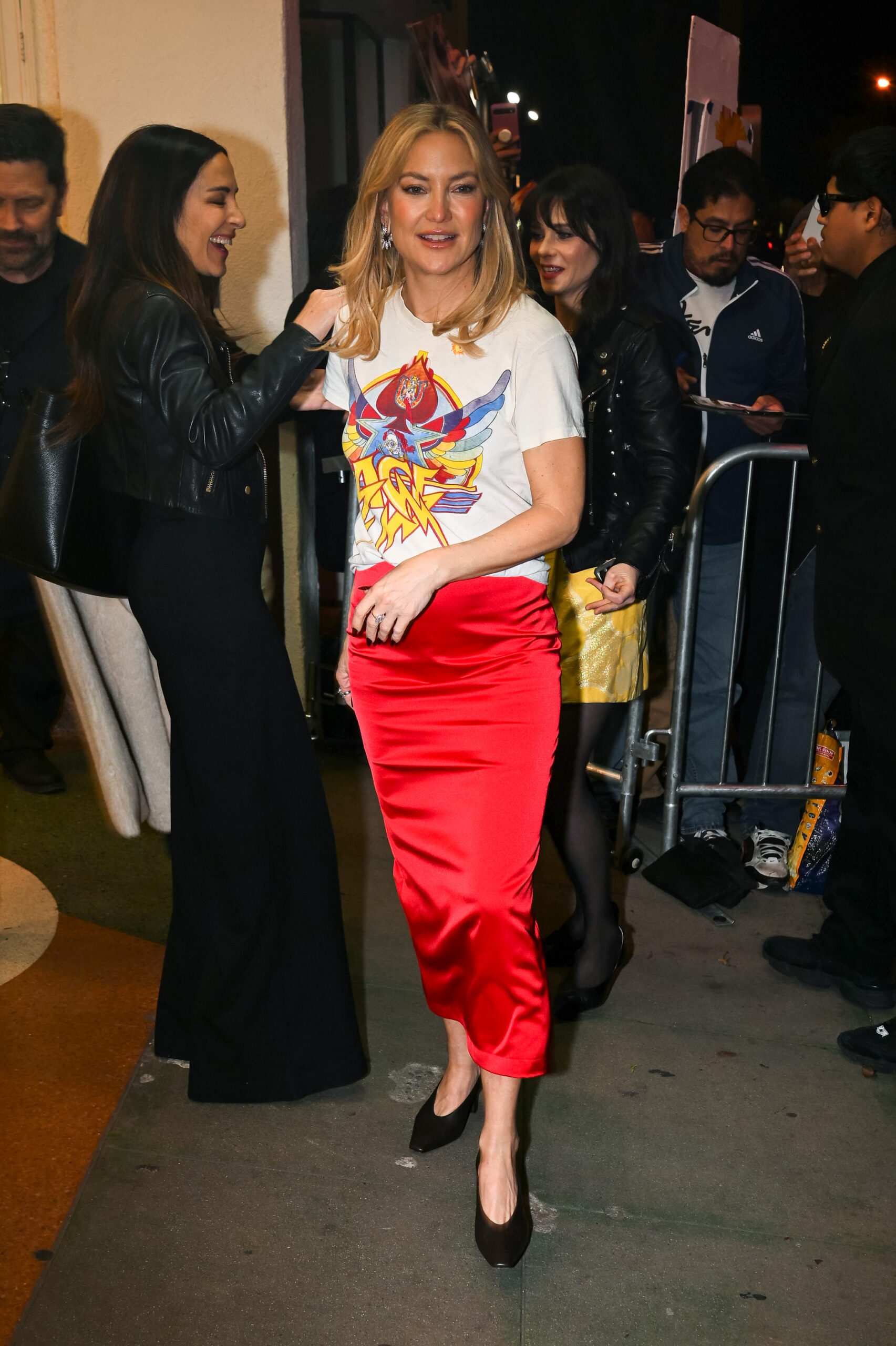 Επέλεξε με μια κόκκινη σατέν φούστα-μία από τις πιο δυνατές τάσεις του χειμώνα 2026-που ταίριαζε τέλεια με την χρωματική παλέτα του σχεδίου. Ολοκλήρωσε το look με μαύρες γόβες και διαμαντένια σκουλαρίκια, ενώ το μαύρο μανικιούρ της έδωσε ακόμη περισσότερη ένταση και attitude στο look.