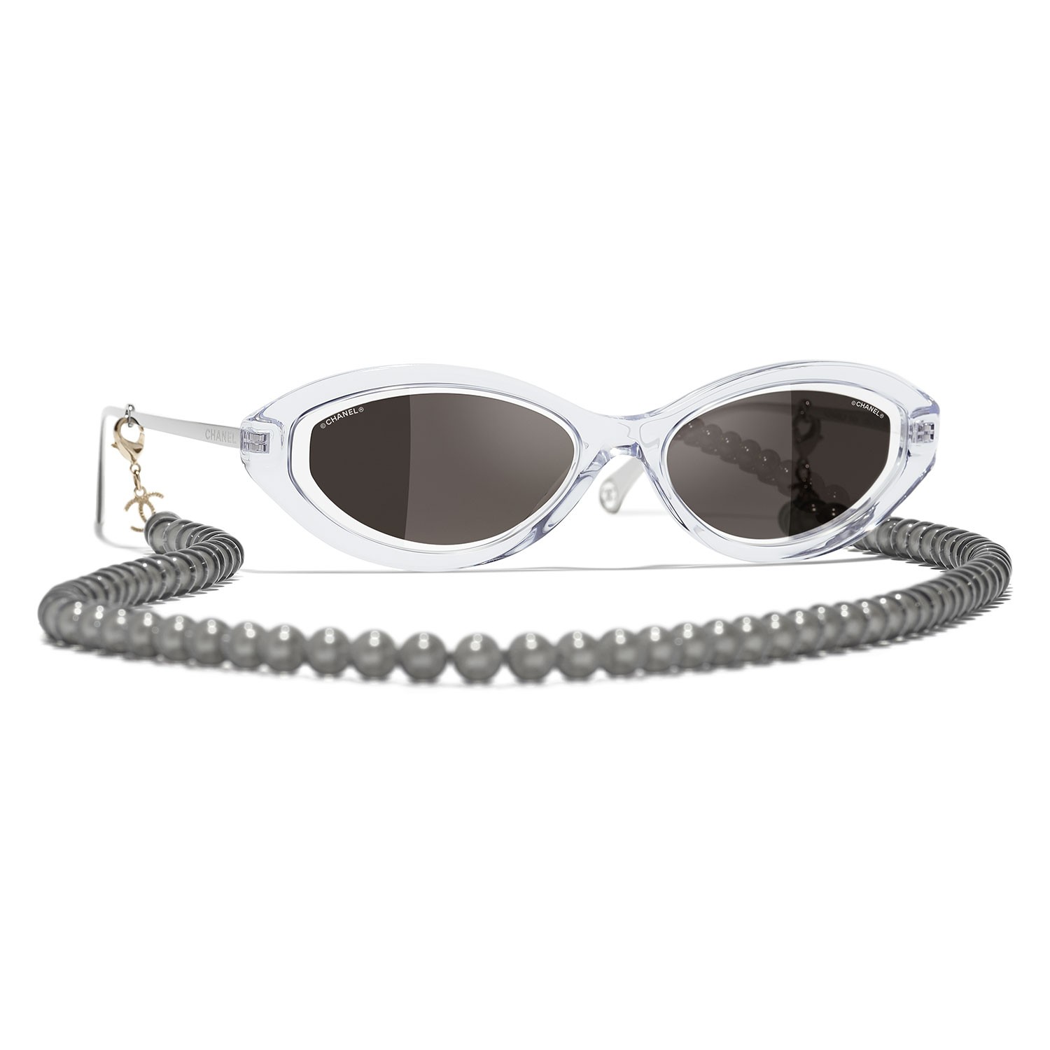 Κάθε ζευγάρι γυαλιών ηλίου υπογραμμίζει την πρωτοτυπία αυτών των εμπνευσμένων προσώπων. Για την Angèle, είναι ένα οβάλ σχέδιο με διαφανές πλαίσιο που έρχεται σε αντίθεση με τους μεταλλικούς βραχίονες στους οποίους είναι προσαρτημένο ένα κολιέ από γκρι faux μαργαριτάρια.