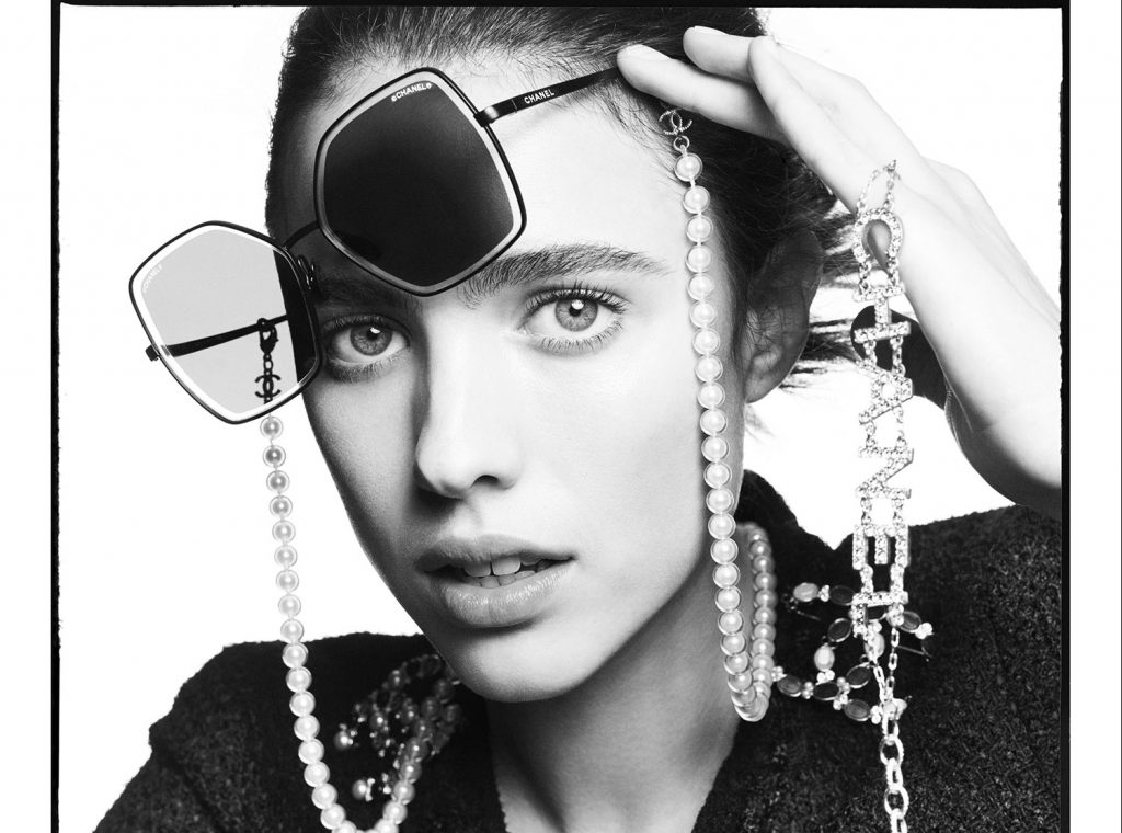 Το πρόσωπο της Margaret Qualley αποκαλύπτεται πίσω από ένα ζευγάρι σε σχήμα πεταλούδας με μεταλλικό σκελετό, επίσης συνδεδεμένο με μια σειρά από μαργαριτάρια, αυτή τη φορά σε λευκό χρώμα.