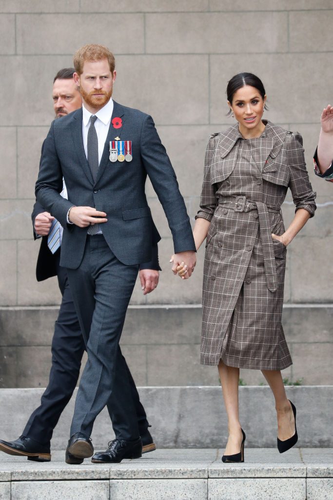 Για την περίσταση, η Markle φόρεσε μια καρό καμπαρντίνα από τη σχεδιάστρια με έδρα τη Νέα Ζηλανδία, Karen Walker, μια ιδιαίτερα κατάλληλη επιλογή για το σκηνικό. Η διαχρονική καμπαρντίνα είναι μία από τις must-have σιλουέτες της σεζόν ενώ με το καρό τύπωμα της Markle έμοιζε ιδιαίτερα φρέσκια. Κάτω από το παλτό της, η Δούκισσα φορούσε ένα απλό μαύρο φόρεμα που επέτρεπε στο εξωτερικό ένδυμα να λάμψει.