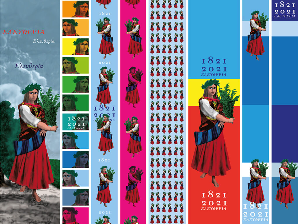 Φορώντας στο κεφάλι το δάφνινο στεφάνι, κρατώντας δοξαστικά φύλλα δάφνης, ενδεδυμένη με παραδοσιακή γιορτινή φορεσιά και με γυμνά πέλματα που πατούν απευθείας το ελληνικό χώμα, έχει το βλέμμα στραμμένο στο μέλλον, με μια αισιοδοξία χαρακτηριστική της φύσης του Έλληνα. Η λέξη «Ελευθερία» καθώς και οι χρονολογίες 1821 -2021 σε διάφορα σημεία του καμβά λειτουργούν ως κορωνίδα υπογραμμίζοντας τον επετειακό χαρακτήρα του σχεδίου.