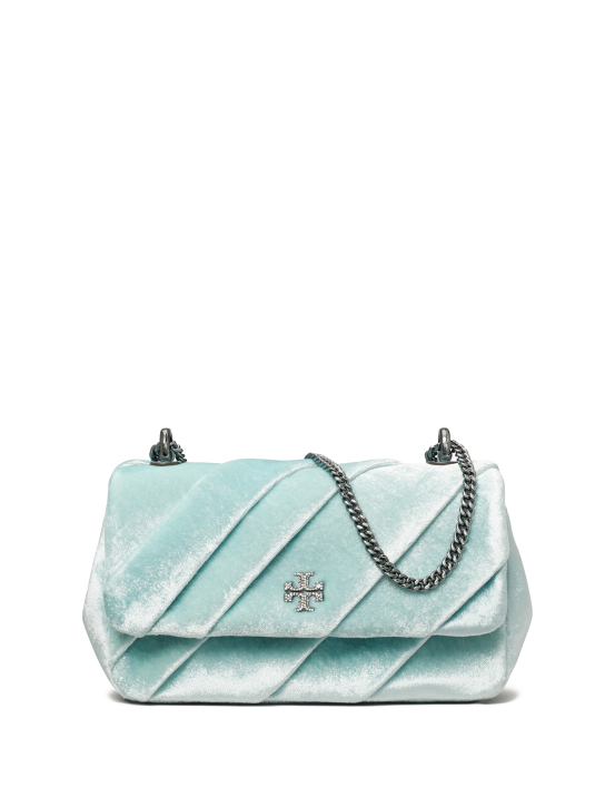 Τσάντα ώμου Mini Kira Draped Velvert Flap Bag από σιέλ βελούδο με ρυθμιζόμενη αλυσίδα ώμου και διακοσμημένη με χρυσή μεταλλική αγκράφα, Tory Burch