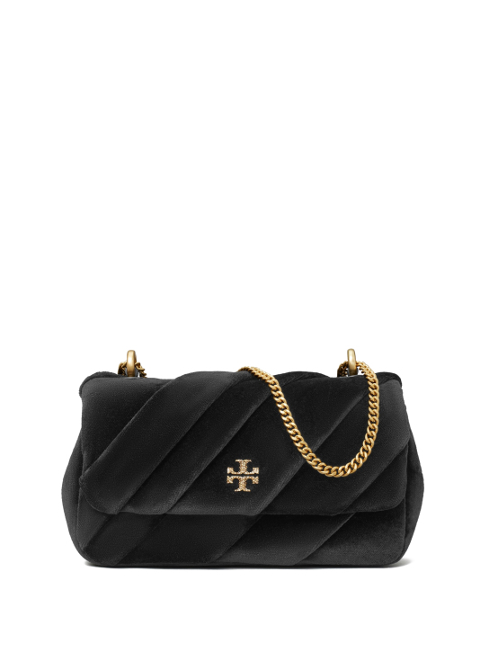 Τσάντα ώμου Mini Kira Draped Velvet Flap Bag από μαύρο βελούδο με ρυθμιζόμενη αλυσίδα ώμου και διακοσμημένη με χρυσή μεταλλική αγκράφα, Tory Burch