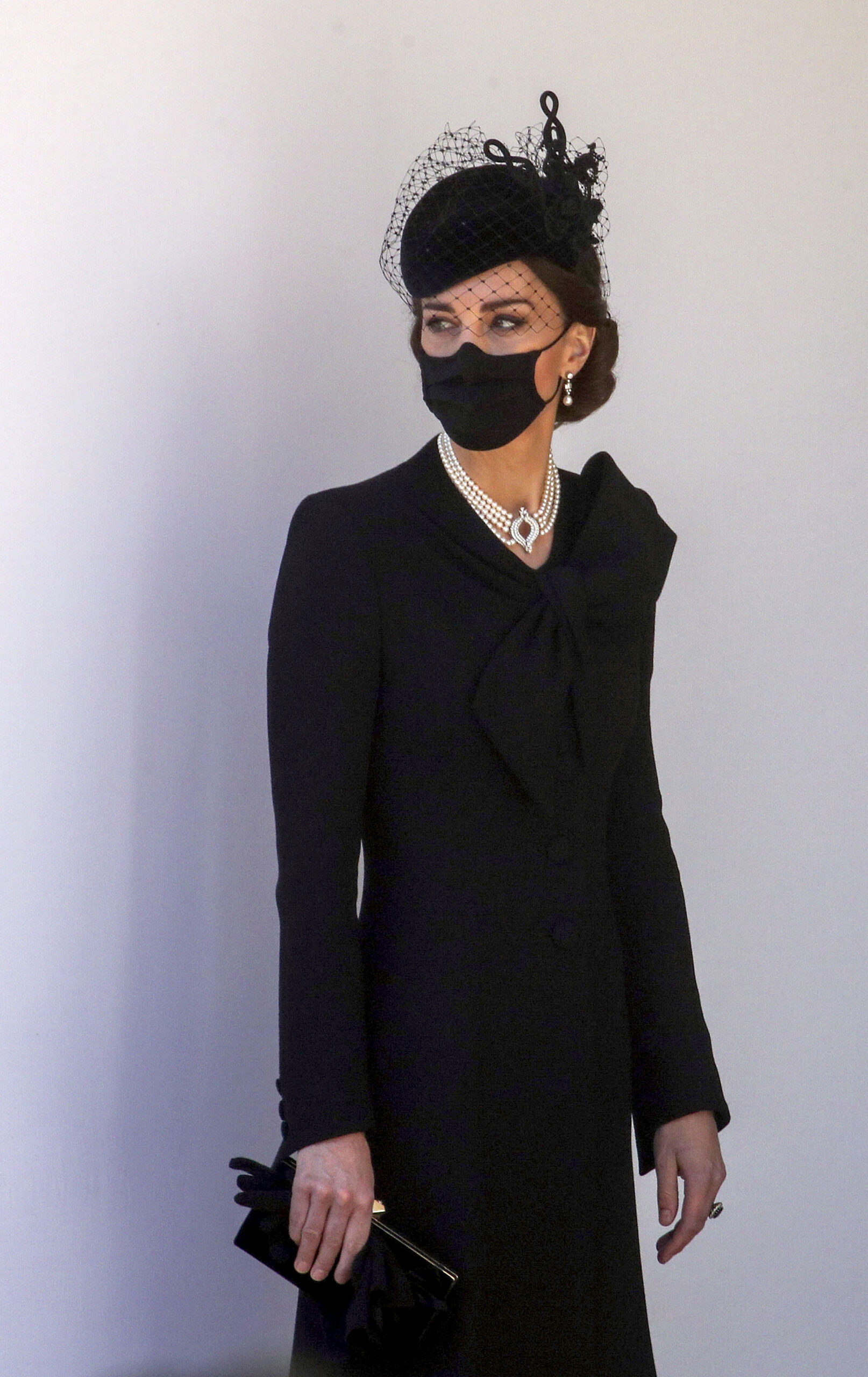 Πέραν του εκλεκτού περιλαιμίου, η Κέιτ Μίντλετον ήταν, για άλλη μία φορά η επιτομή της κομψότητας, της σοβαρότητας, του σεβασμού στην πένθιμη περίσταση. Επέλεξε ένα μάξι παλτό, μέσα από το οποίο φόρεσε ένα μαύρο φόρεμα του Γάλλου μόδιστρου Roland Mouret, αξίας 1.850 ευρώ. Το πρόσωπο της δούκισσας του Κέιμπριτζ -εκτός της υποχρεωτικής μάσκας- κάλυπτε μαύρο βέλο, προσαρμοσμένο στο διακριτικό βελούδινο καπέλο του φημισμένου πιλοποιού Philip Treacy.