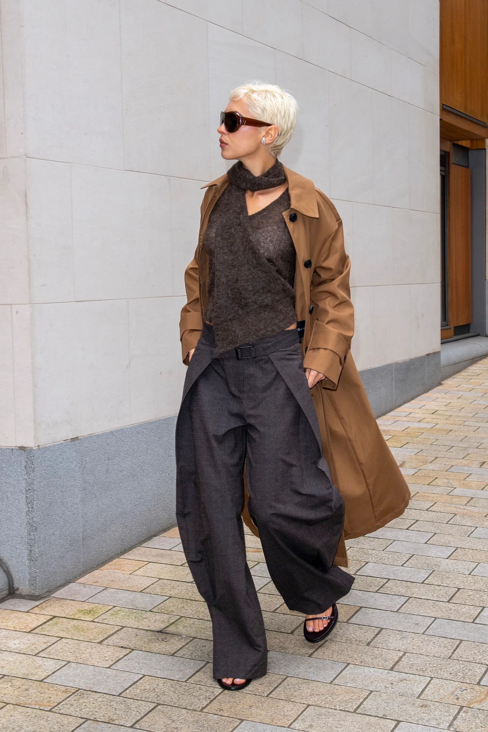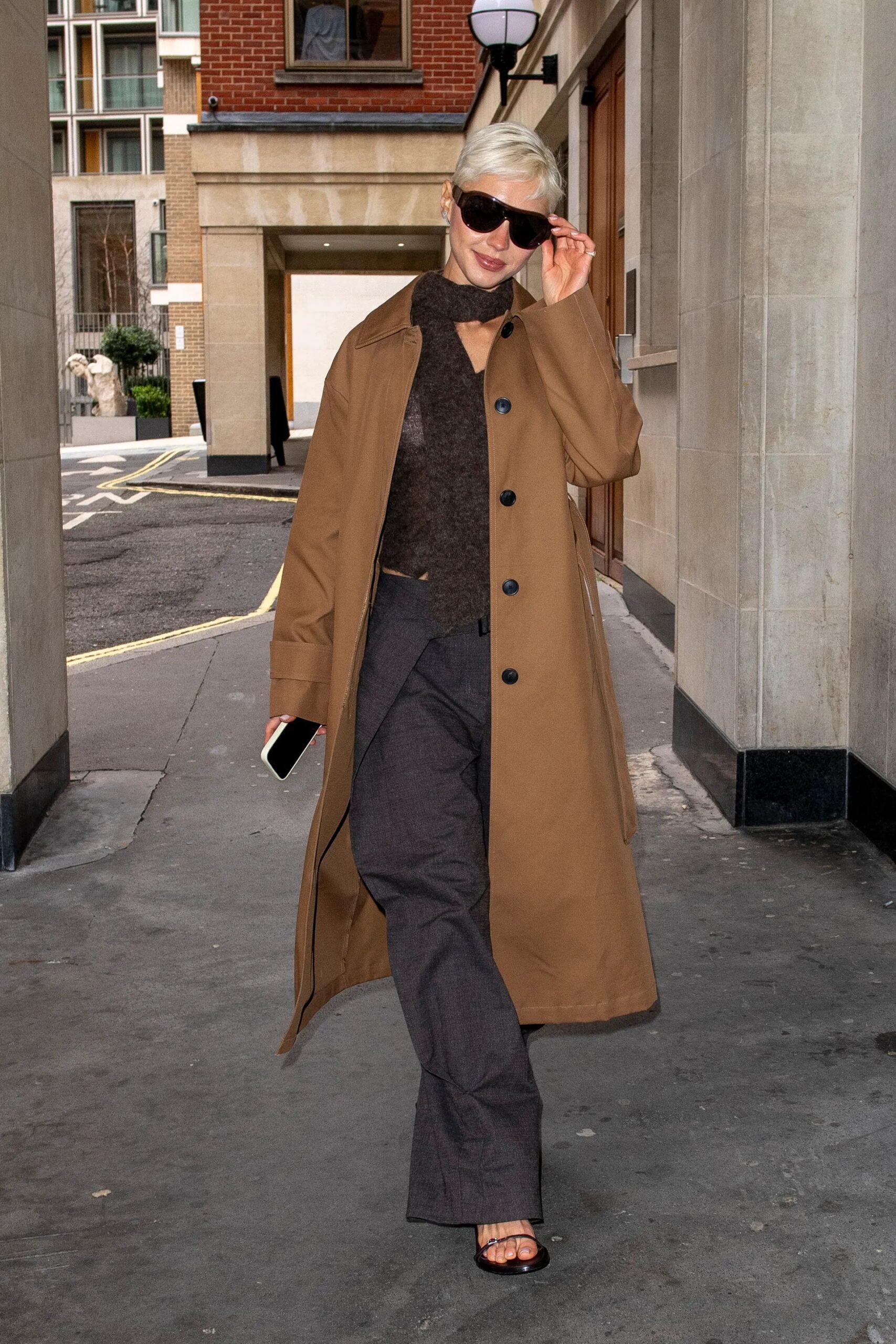 Το look ξεκινούσε με ένα ασύμμετρο tank top από ημιδιάφανο ύφασμα. Αντί να δέσει τον κόμπο στη μέση, όπως προτείνει ο ισπανικός οίκος, εκείνη τον τύλιξε γύρω από τον λαιμό σαν φουλάρι. Στη συνέχεια επέλεξε το παντελόνι με πιέτες της Mango. Ακόμη και η καμπαρντίνα της έφερε την ετικέτα Mango σε μια πιο θερμή μπεζ απόχρωση που δημιουργούσε ενδιαφέρουσα αντίθεση με τα πιο χειμερινά layers του συνόλου και έκανε τα πέδιλά της να δείχνουν πιο επίκαιρα για τη σεζόν.