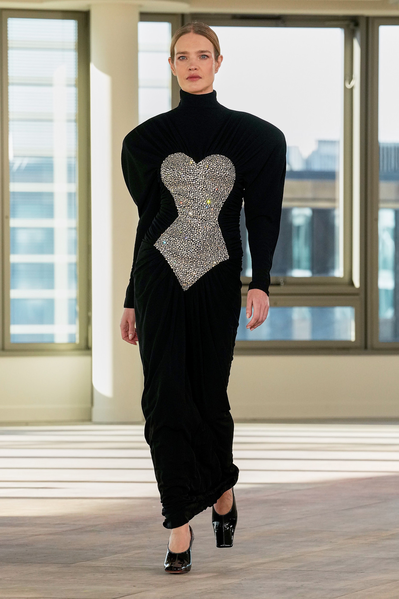 Η εφαρμογή και οι αναλογίες δείχνουν πολύ πιο ισορροπημένες, ενώ οι ώμοι έχουν «μαλακώσει» σε σχέση με τη πιο αυστηρή εκδοχή της πασαρέλας, κάτι που κολακεύει περισσότερο τη σιλουέτα της. Εκεί που το στολισμένο μπούστο στο runway look κυριαρχούσε, αυτή η πιο λιτή προσέγγιση αφήνει τη γραμμή του φορέματος να πρωταγωνιστήσει.