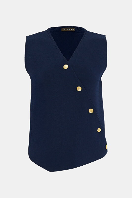 Το γιλέκο με χρυσά κουμπιά και το χρώμα του ναυτικού μπλε μας κέρδισε με την διακριτική φινέτσα του. Συνδυασμένο με χρυσά κοσμήματα και λευκό παντελόνι, ή σαν top μέσα από ένα κοστούμι λειτουργεί ιδανικά πρωί ή βράδυ.