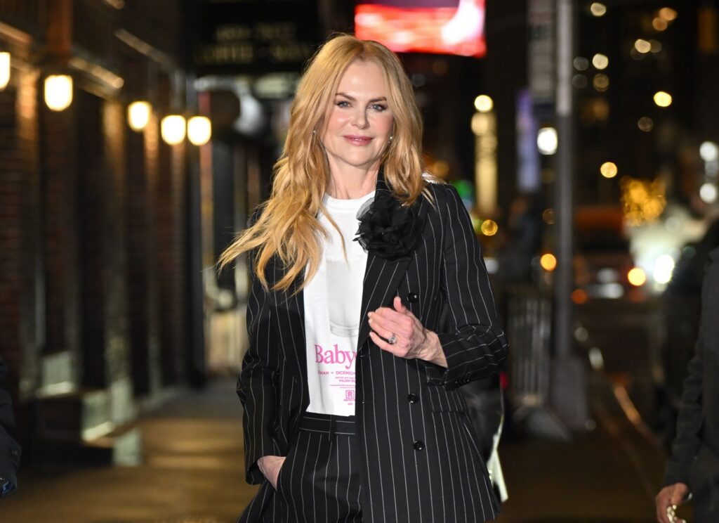 Αυτή τη φορά λοιπόν η Nicole Kidman αναπαρήγαγε το look συνδυάζοντας αυτή τη φορά το ριγέ παντελόνι της με ένα μπλουζάκι Babygirl και μια τεράστια τσάντα Balenciaga, ενώ ολοκλήρωσε την εμφάνιση με ένα ζευγάρι pointy-toe γόβες.