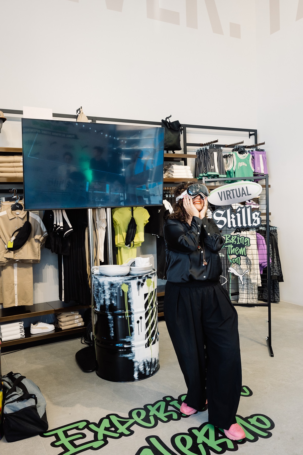 VIRTUAL REALITY SKILLS: ένα ειδικά διαμορφωμένο corner- για τους λάτρεις της τεχνολογίας. Το κατάστημα φιλοξένησε τα APPLE vision pro, τα «μαγικά» γυαλιά που ήρθαν στην Ελλάδα αποκλειστικά και μόνο για το opening event της PUMA, δίνοντας στον επισκέπτη τη ευκαιρία να γίνει ο ίδιος μέρος της εικονικής πραγματικότητας. Οι καλεσμένοι είχαν τη δυνατότητα να «μπουν» μέσα στο νέο sneaker της PUMA, Palermo, και να το δουν virtually σπιθαμή προς σπιθαμή.