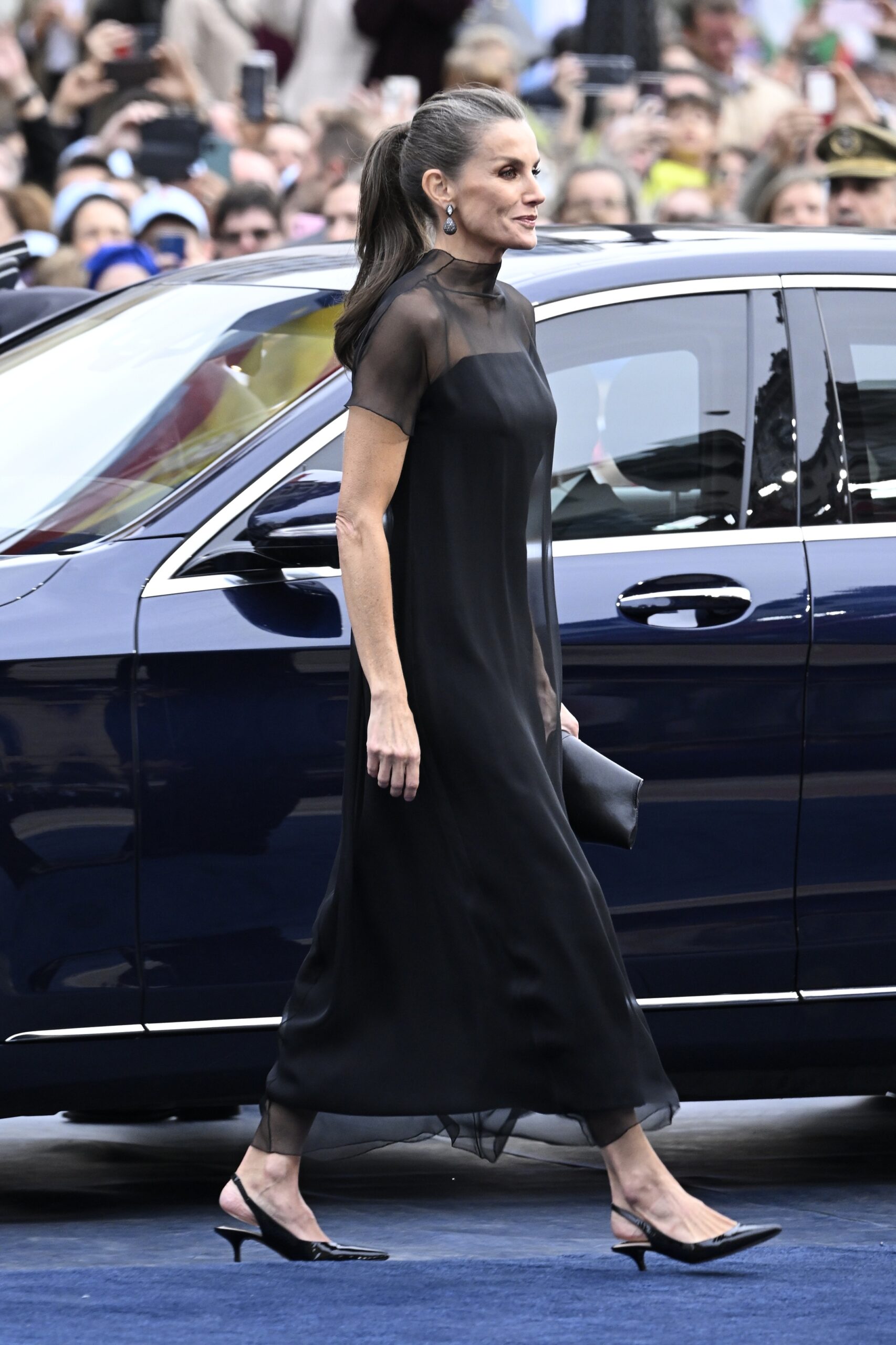 Η βασίλισσα Λετίσια επιβεβαίωσε για ακόμη μια φορά την αφοσίωσή της στη διαχρονική, απέριττη κομψότητα, εμφανιζόμενη με ένα ολόμαυρο σύνολο της Sybilla, το οποίο έχει φορέσει ξανά στο παρελθόν. Το φόρεμα, από μαύρο μεταξωτό κρεπ, αγκάλιαζε τη σιλουέτα με εσωτερικό κορσέ, ενώ πάνω του έπεφτε μια ημιδιάφανη κάπα με κοντά μανίκια, δημιουργώντας έναν ανάλαφρο, ρευστό όγκο.