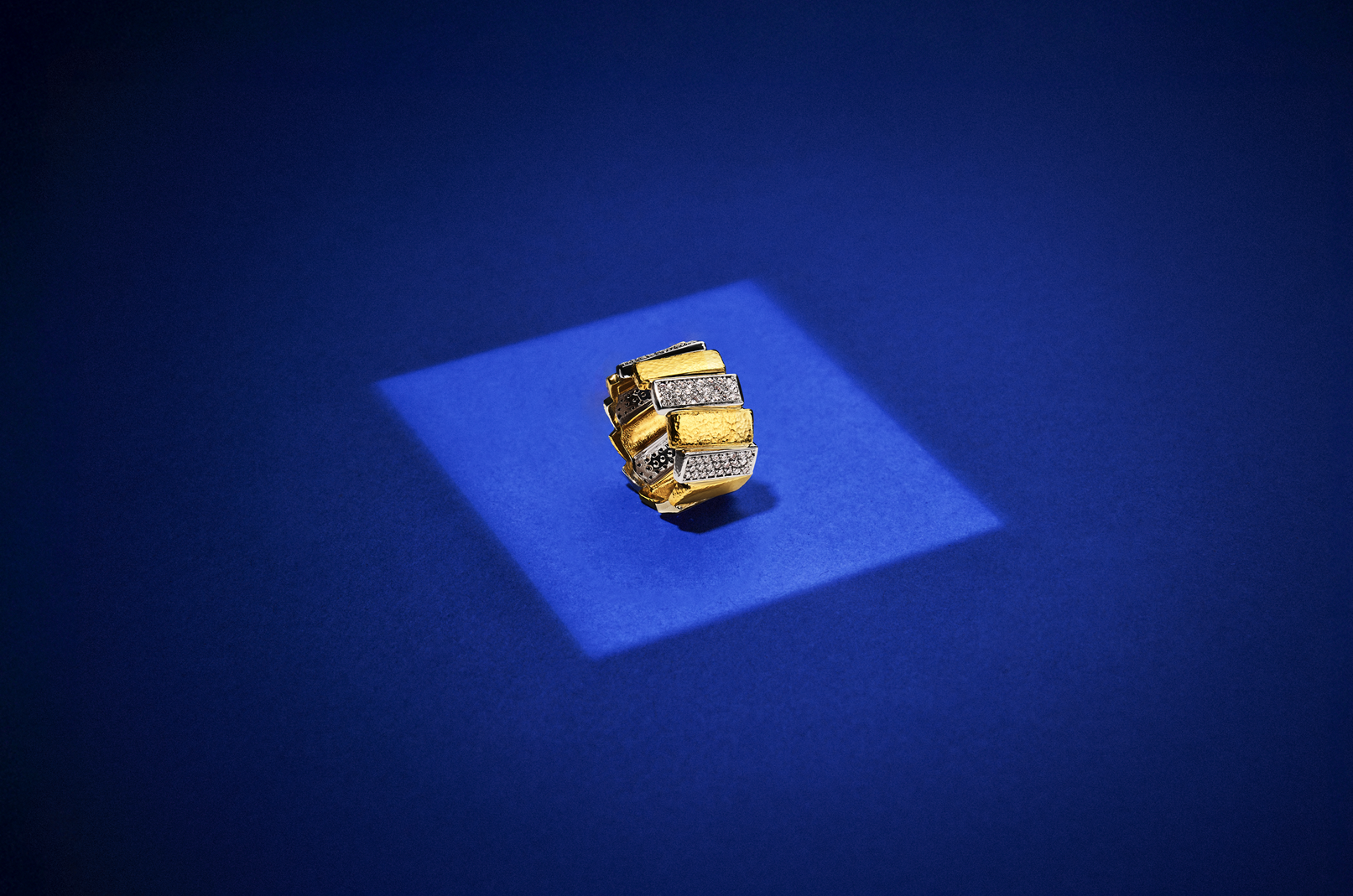 Σφυρήλατος χρυσός 22 καρατίων, σε αρμονικό διάλογο με με πολύτιμες κιτρίνες, ακουαμαρίνες και διαμάντια, συνθέτουν μια εντυπωσιακά σύγχρονη σύνθεση υψηλής κοσμηματοποιίας που αποπνέει δύναμη κι εκλεπτυσμένη λάμψη.
