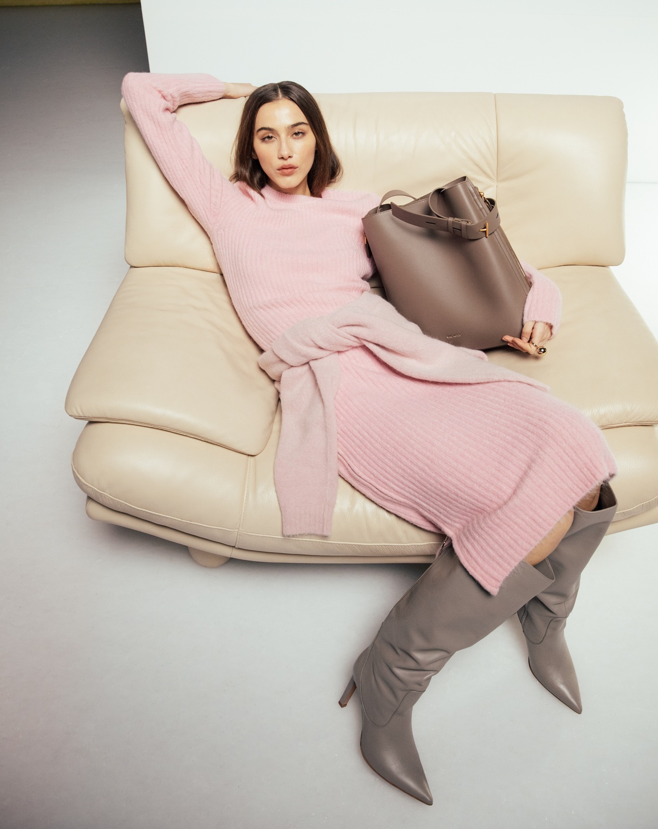 Το look εκπέμπει ηρεμία και άνεση, χωρίς να στερείται χαρακτήρα. Καθοριστικό ρόλο παίζουν τα αξεσουάρ σε αντίθεση, σε απόχρωση taupe γκρι. Οι ψηλές μυτερές μπότες της Gino Rossi και η minimal τσάντα του ίδιου brand «σπάνε» υπέροχα τη γλυκιά παστέλ βάση. Αυτή η πιο ψυχρή απόχρωση αναβαθμίζει το σύνολο, προσθέτοντας σύγχρονο βάθος και κομψότητα. Είναι το τέλειο παράδειγμα του πώς τα σωστά αξεσουάρ μπορούν να καθορίσουν ένα look και να μετατρέψουν ένα απλό, άνετο φόρεμα σε ένα fashion-forward σύνολο.