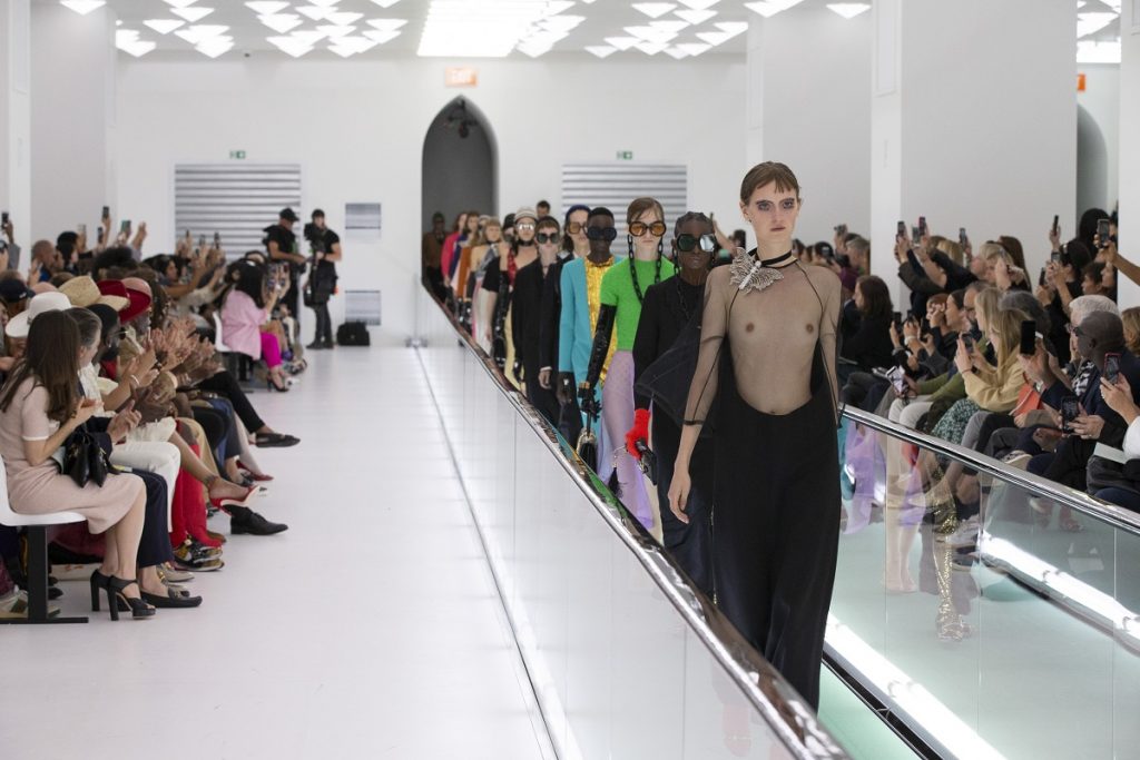 Τα μοντέλα φορούσαν γιγαντιαία γυαλιά ηλίου με υπερμεγέθεις αλυσίδες από perspex και αθλητικά παπούτσια κάτω από τα cropped παντελόνια τους ενώ δεν έλειπαν φυσικά και τα gender-neutral σχέδια σε μια χρωματική παλέτα που περιελάμβανε βιολετί, πράσινο της μέντας και μπορντό. Για το κόκκινο χαλί, υπήρχαν διακοσμημένα με πούλιες και floral μοτίβα φορέματα ενώ για τη διάρκεια της ημέρας υπήρχαν σακάκια και παλτό τονισμένα στη μέση με ζώνες, πάνω από κοστούμια.