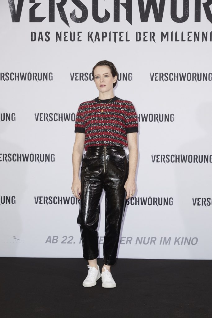 Γνωστή για την προτίμησή της στα εμπνευσμένα από την ανδρική ντουλάπα ενδύματα, η Foy απολαμβάνει να παίζει με τις εμφανίσεις της στο κόκκινο χαλί φορώντας οτιδήποτε άλλο εκτός από ένα παραδοσιακό φόρεμα. Σε πρόσφατη συνέντευξη τύπου που έδωσε για τη νέα της ταινία, The Girl in the Spider’s Web, η ηθοποιός φωτογραφήθηκε με ένα από βινύλ παντελόνι από το δημοφιλές brand Kitri Studio. Ηταν ψηλόμεσο, είχε ένα εξωτερικό φερμουάρ και ένα μήκος που αποκάλυπτε τους αστραγάλους της ενώ το συνδύασε με ένα ριγέ κοντομάνικο πουλόβερ σε κόκκινο και μαύρο. Αντί για ένα ζευγάρι γόβες ή ψηλοτάκουνα booties, έκανε μια πολύ πιο άνετη επιλογή από κομψά, λευκά παπούτσια τένις.