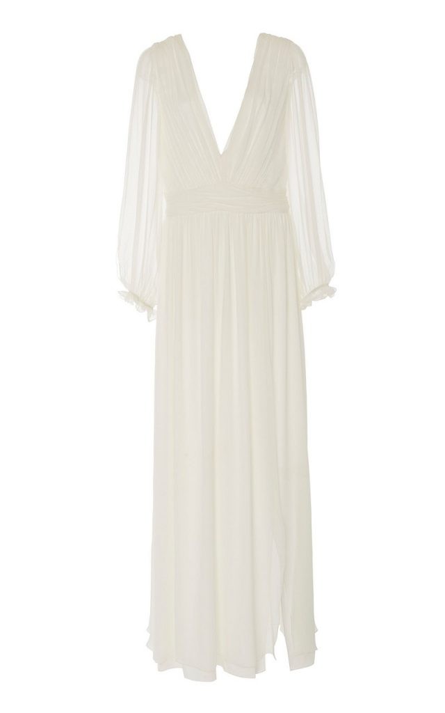 Για την ιδιαίτερη περίσταση η Λόρενς επέλεξε το Juliana dress από την ανοιξιάτικη συλλογή του brand L. Wells Bridal. Ήταν φτιαγμένο από μεταξωτό σιφόν, είχε μακριά μανίκια, βαθύ V ντεκολτέ και ένα βαθύ σκίσιμο στο πλάι.
