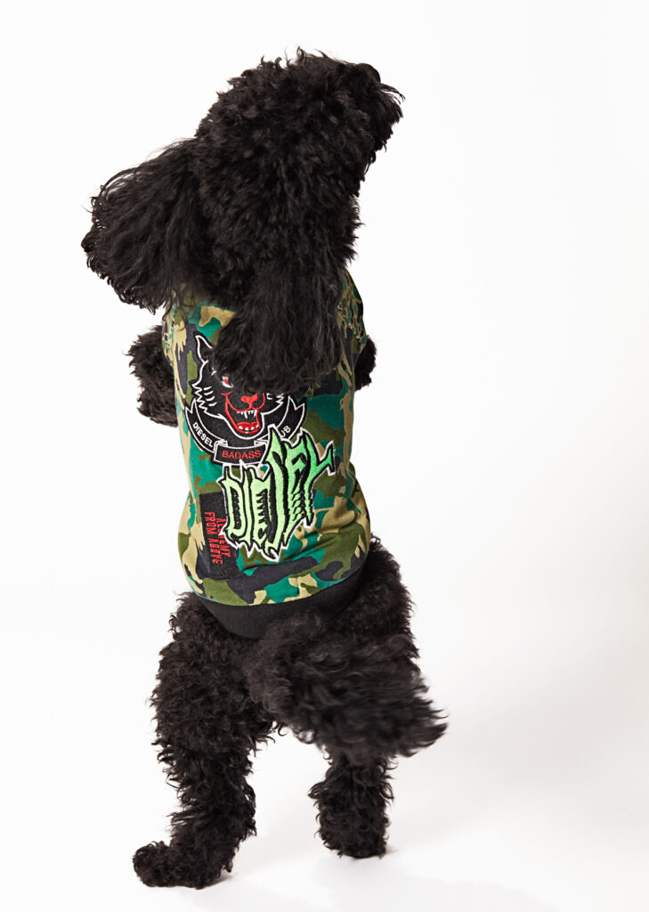 Τα δύο τζιν σακάκια στη συλλογή Diesel Doggies θα είναι διαθέσιμα σε indigo μπλε και μαύρο, με αντίστοιχα patchwork στην πλάτη. Σχεδιαστικά στοιχεία του brand ενώνονται για να δώσουν στο σκυλάκι σας ένα punk look. Τα πουλόβερ θα είναι διαθέσιμα σε design καμουφλάζ και σε γκρι χρώμα, με γραφικά και στα δύο.