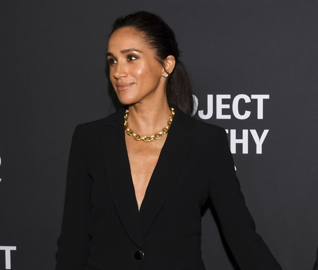 Η Μeghan ολοκλήρωσε το μονόχρωμο σύνολο με μαύρες γόβες pointed-toe επίσης του Armani, καθώς και με ένα σατέν La Prima clutch του οίκου. Από κοσμήματα, κράτησε ένα μίνιμαλ ύφος, επιλέγοντας μόνο ένα διπλό χρυσό κολιέ της Annie Bing.