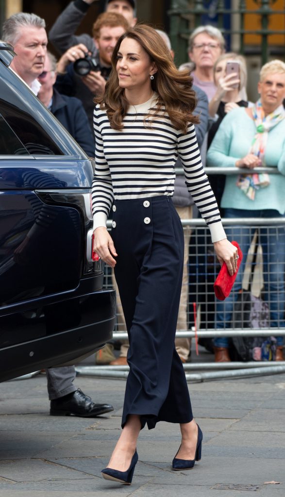 H Δούκισσα φορούσε ένα ριγέ πλεκτό τοπ σε λευκό-μπλε με ένα ψηλόμεσο παντελόνι διακοσμημένο με κουμπιά από το αγαπημένο της brand, L.K. Bennett. Πρόσθεσε μια πινελιά έντονου χρώματος με μια κόκκινη σουέτ τσάντα-φάκελο και ολοκλήρωσε το look με ένα ζευγάρι μπλε σουέτ γόβες με τετράγωνο τακούνι ενώ ολόκληρη η εμφάνιση στο σύνολό της έμοιζε με κάτι που θα μπορούσαμε άνετα να δούμε στους δρόμους του Παρισιού.
