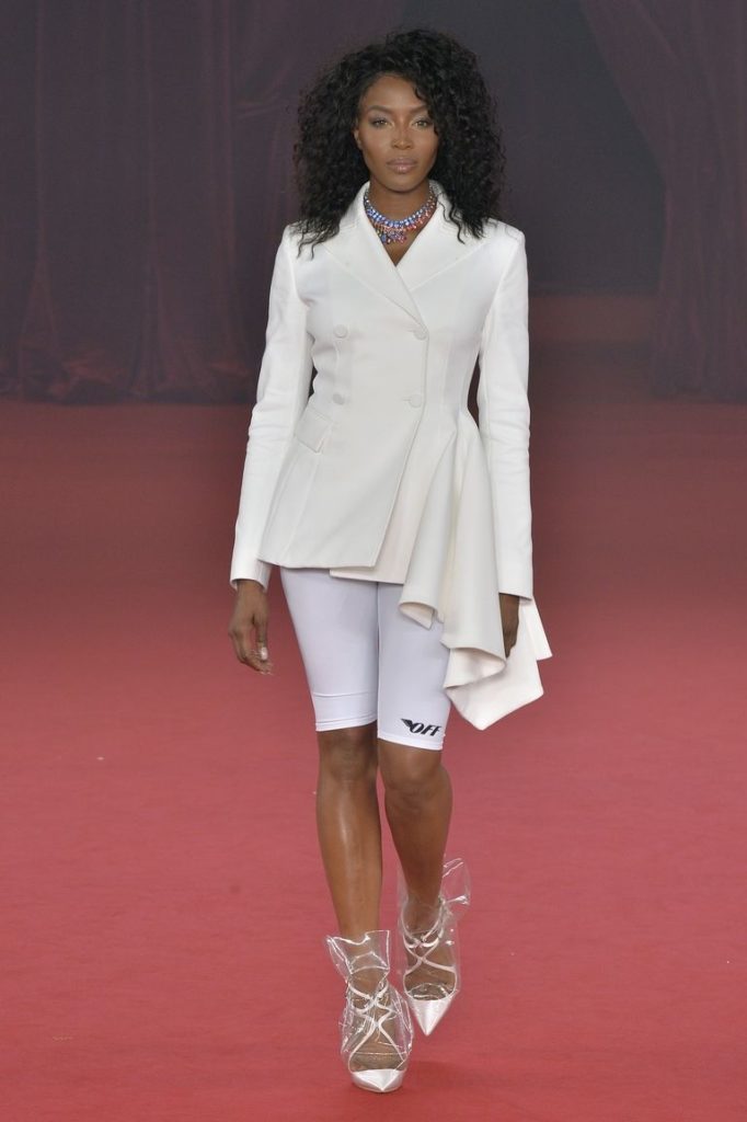 Το συνδύασε με στρογγυλά γυαλιά ηλίου, λευκό καπέλο, διαφανή τσάντα και ένα ζευγάρι μαύρες γόβες καλυμμένες με πλαστικό από την επερχόμενη συνεργασία της Off-White με τον Jimmy Choo.