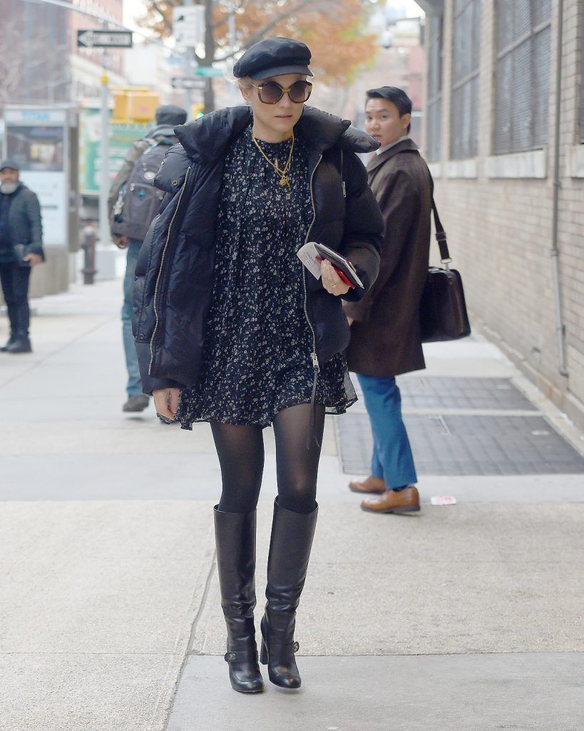 Η ηθοποιός επέλεξε ένα κοντό μαύρο puffer, κι έδωσε στην εμφάνισή της μια ελαφρύτερη, λιγότερο σοβαρή πινελιά, συνδυάζοντάς το με ένα εμπριμέ μίνι φόρεμα. Φρόντισε ωστόσο το σύνολό της να είναι πρακτικό: φορούσε μαύρο καλσόν για ζεστασιά, καθώς και δερμάτινες μπότες κάτω από το γόνατο. Ολοκλήρωσε το look με ένα καπέλο newsboy, υπερμεγέθη γυαλιά ηλίου και χρυσές αλυσίδες για το αβίαστα cool φινίρισμα που πάντα χαρακτηρίζει τις εμφανίσεις της.