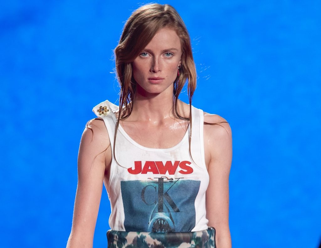 Για αρκετές σεζόν τώρα, ο Raf Simons συμπεριφέρεται στα runways του για τον Calvin Klein, σαν ταινίες μικρού μήκους. Οι περισσότερες από τις συλλογές του – αν όχι όλες ήταν τρομερά επιτυχημένες από τότε που έκανε το ντεμπούτο του στον οίκο το 2017, όλες όμως έχουν τις ρίζες τους στην ίδια ιδέα: ότι είναι μια σκοτεινή εποχή για την Αμερική. Η συλλογή του για την άνοιξη του 2019 είναι ένας φόρος τιμής στην πριν το Watergate ταινία “Τα σαγόνια του καρχαρία” και περιελάμβανε κουρελιασμένα, πιτσιλισμένα με αίμα ρούχα που έμοιαζαν σαν να έχουν δαγκωνιές από καρχαρίες.
