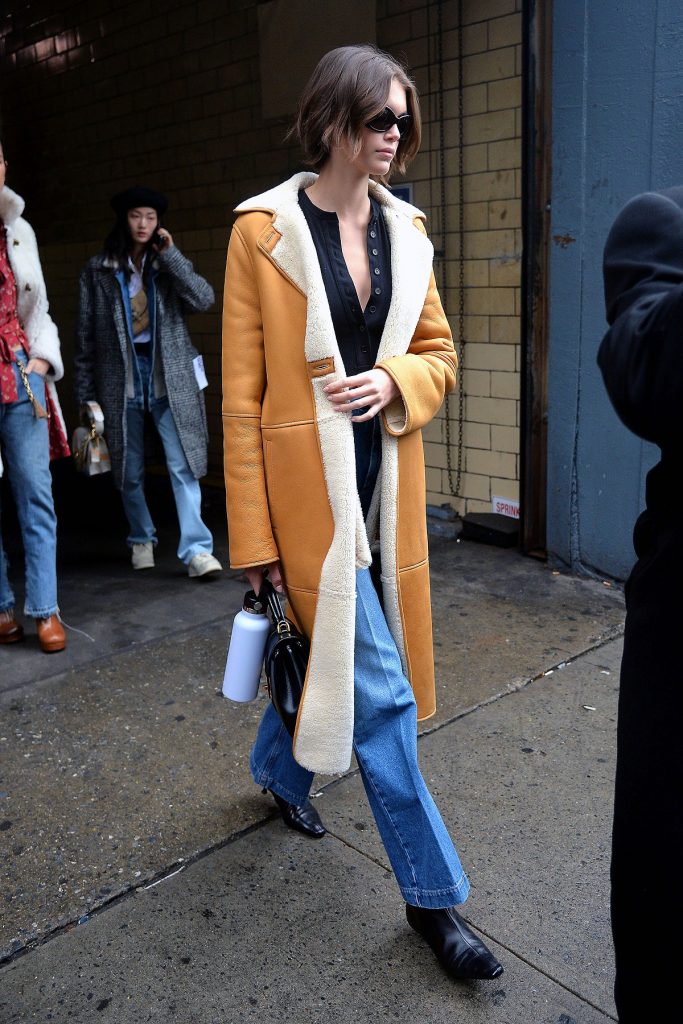 Η Gerber εντοπίστηκε στη Νέα Υόρκη καθώς έφευγε από την επίδειξη Coach στις 11 Φεβρουαρίου φορώντας το ζεστό παλτό μαζί με ένα flare ντένιμ παντελόνι, επίσης από την Loewe. Ολοκλήρωσε την εμφάνιση με ένα Henley τοπ με κουμπάκια, απλές μαύρες μπότες με kitten heels και τη μεγάλη 16 Bag της Celine, δίνοντάς στο σύνολό της μια ξεχωριστή ’70s αίσθηση.