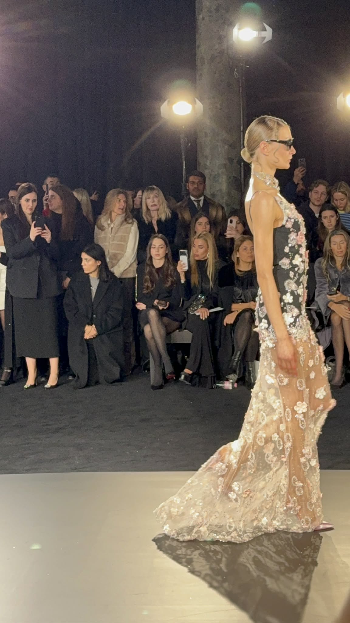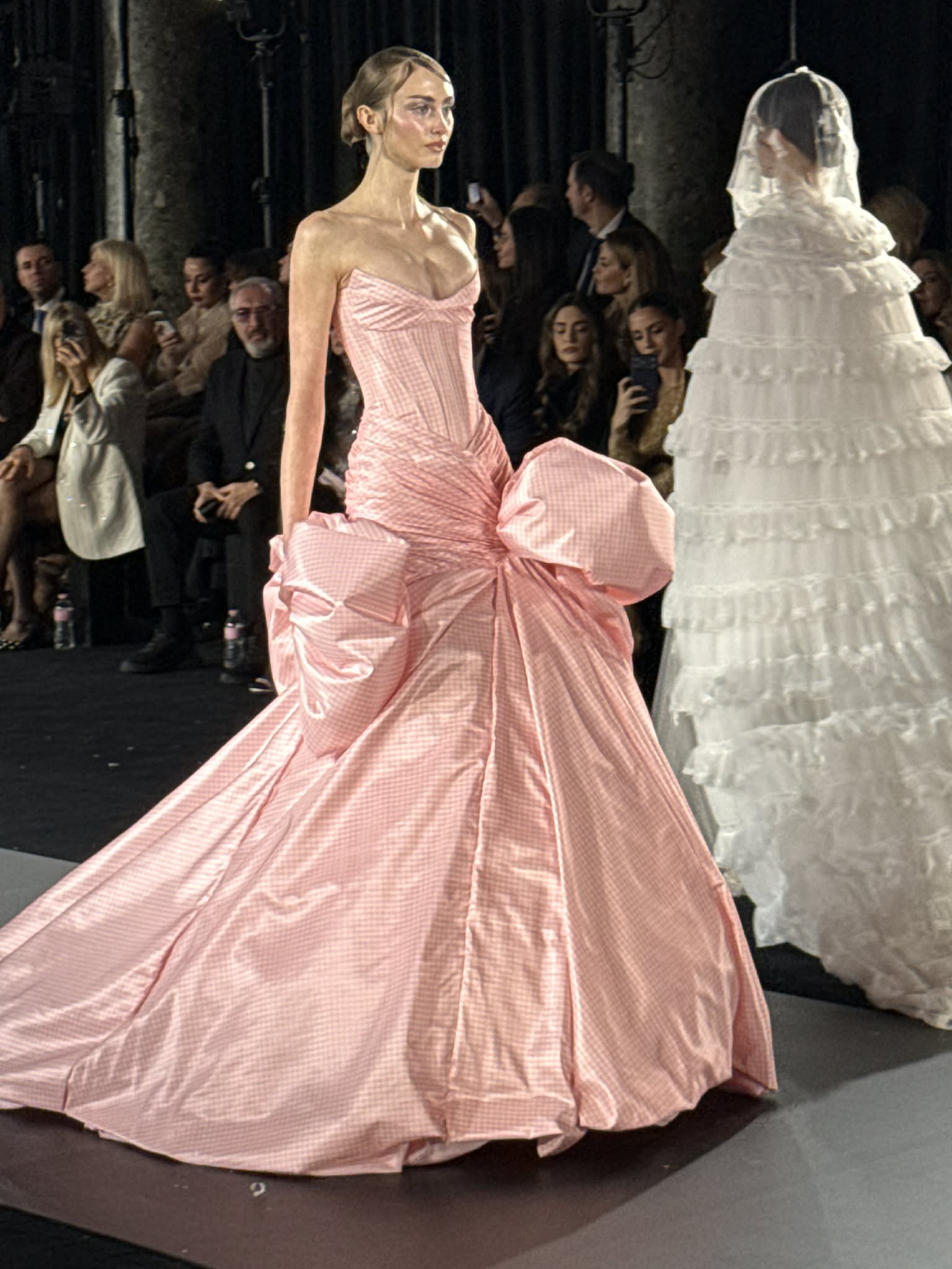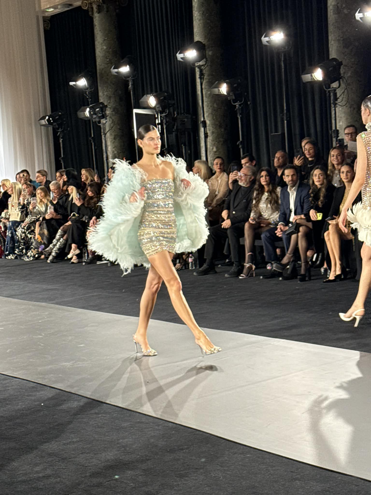 Συνδυάζοντας την πολυτέλεια με τη λεπτότητα, οι δημιουργίες αποπνέουν χάρη και λάμψη. Κρόσσια, περίτεχνα απλικέ από φλοράλ δαντέλα, αλυσίδες από κρύσταλλα και ροζέτες από οργάντζα αναδεικνύουν την υψηλή ραπτική στην πιο αγνή της μορφή. Η συλλογή αντλεί από την τεχνογνωσία των petites mains του οίκου και ενός αστερισμού ιστορικών παριζιάνικων ατελιέ, ανάμεσά τους τα Maison Lemarié και Maison Lesage. Αέρινες σιλουέτες από τούλι και σιφόν ολοκληρώνονται με εντυπωσιακά μακριά, διάφανα πέπλα που κινούνται γύρω από το σώμα σαν λαμπερός καπνός.