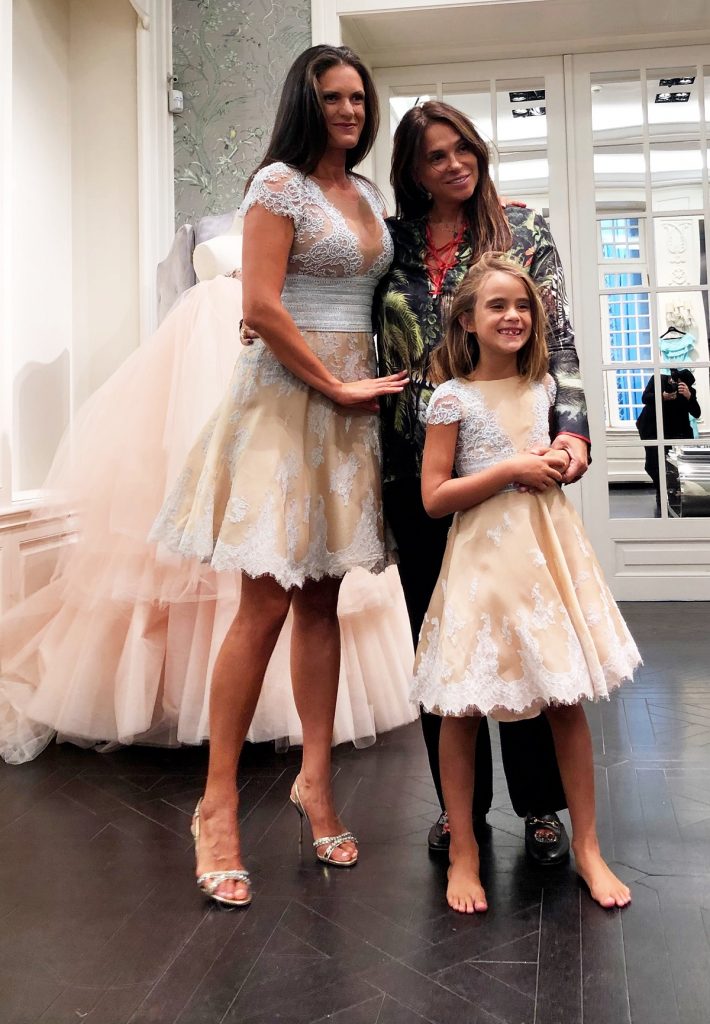 Με δυο ίδιες λαμπερές δημιουργίες υποδέχτηκε ο οίκος Celia Kritharioti Couture της Veronica και Virgina Bocelli, ενόψει της συναυλίας του Andrea Bocelli στο Ηρώδειο. Μητέρα και κόρη φόρεσαν φορέματα με κεντημένη γαλλική δαντέλα σε σιελ απόχρωση και φούστες από οργάντζα με απλικέ δαντέλες.