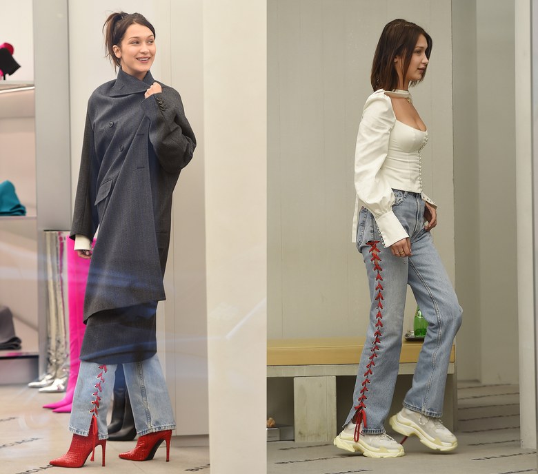 Η Bella Hadid ποζάρει για τους παπαράτσι για το lookbook του Balenciaga όπως η Kim Kardashian για τη σειρά Yeezy 6; Ή απλώς απολαμβάνει μια χαλαρωτική μέρα για ψώνια; Το supermodel εμφανίστηκε στο Λονδίνο φορώντας ένα τοπ σε στυλ κορσέ Orseund Iris, vintage τζιν Danielle Guizio με κορδόνια στο πλάι και κόκκινες μπότες με πανύψηλα τακούνια και επισκέφθηκε το κατάστημα Balenciaga για να δοκιμάσει μερικά κομμάτια, όπως το ασύμμετρο γκρι παλτό του οίκου από τη συλλογή Resort 2018 και τα sneakers Triple S, που είναι ιδανικά για κάθε συνταξιούχο εκεί έξω.