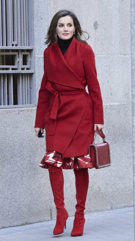 Η Letizia ολοκλήρωσε την εμφάνισή της με ένα υπερμεγέθες παλτό, μια ιδανική σιλουέτα για την printed φούστα με το κλος στυλ. Ένα απλό μαύρο ζιβάγκο άφησε τα υπόλοιπα χρώματα να αναδειχθούν ενώ τα κόκκινα αξεσουάρ -οι κόκκινες above-the-knee μπότες και η chain bag ενίσχυσαν επιπλέον το αποτέλεσμα.