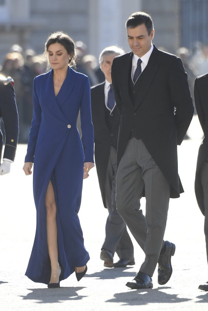 Φορώντας ένα μακρύ wrap dress σε έντονη μπλε απόχρωση το οποίο κούμπωνε με ένα λεπτό ασημένιο κόσμημα, η βασίλισσα Λετίσια πραγματικά ακτινοβολούσε ανάμεσα στα μέλη των ενόπλων δυνάμεων και της βασιλικής στρατιωτικής φρουράς στην παραδοσιακή γιορτή.
