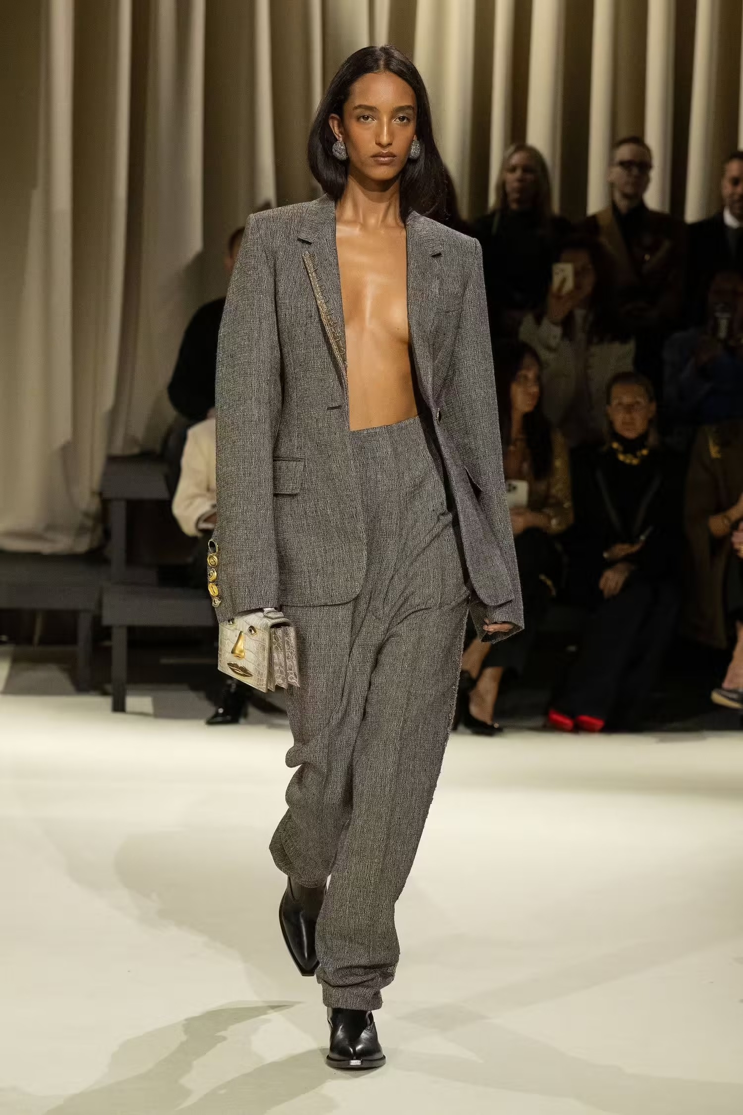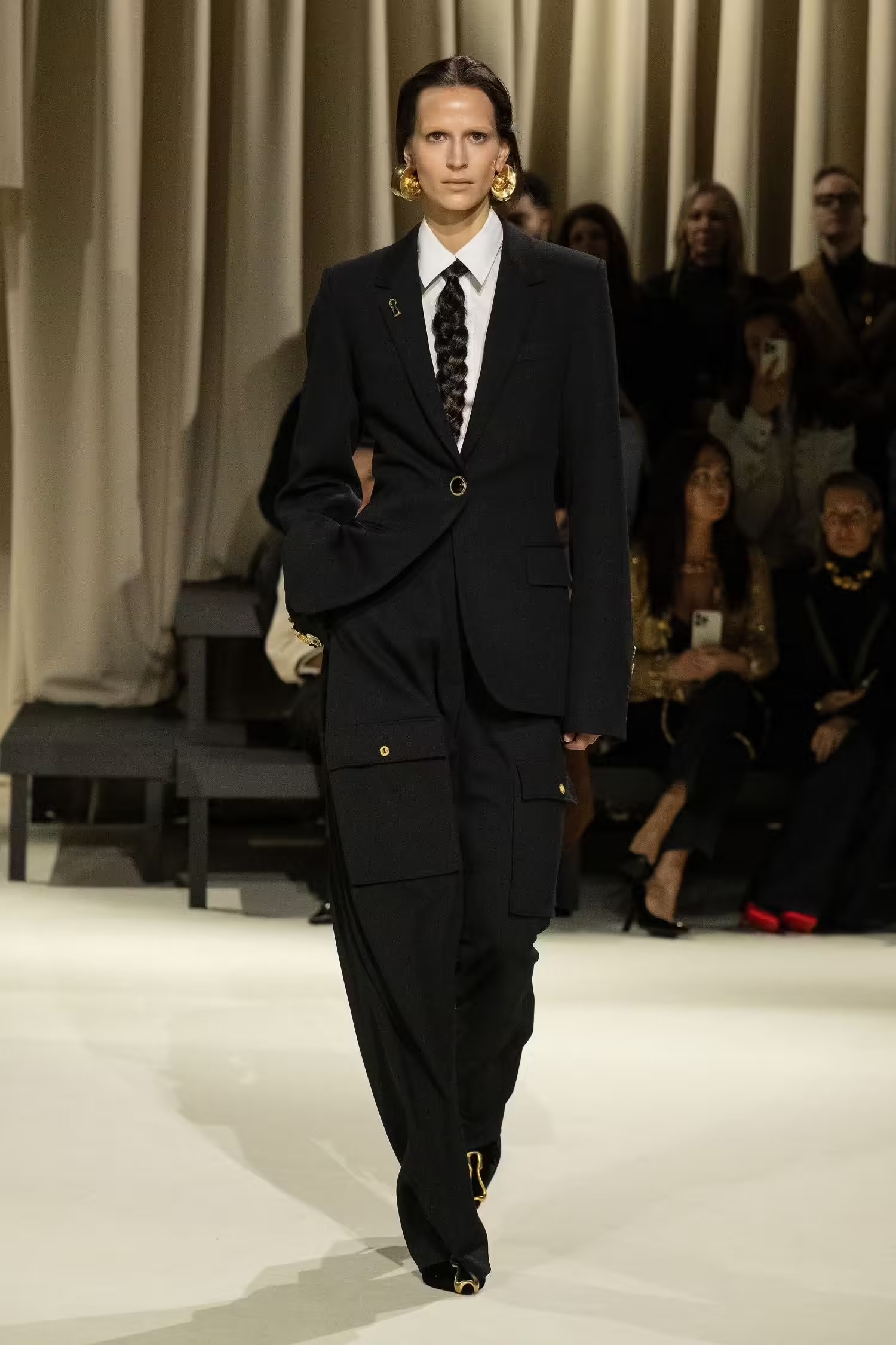 Ένα πρωτοφανές στοιχείο που εντοπίστηκε στην φθινοπωρινή/χειμερινή συλλογή 2024-2025 και τράβηξε αμέσως την προσοχή ήταν οι μαύρες και ξανθές πλεξίδες που χρησιμοποιήθηκαν σαν γραβάτες διακοσμώντας μαύρα, μπεζ και denim σύνολα. Ένα ιδιαίτερο trend που θα διχάσει σίγουρα τις απόψεις. Ο σχεδιαστής ανέφερε ότι άντλησε στοιχεία από κομμάτια που οι γυναίκες επιθυμούν να φορούν στην καθημερινότητά τους. Στην κορυφή της λίστας είναι τα statement πανωφόρια, από ένα σκούρο peacoat με κουμπιά που γράφουν το brand name του οίκου, μέχρι ένα καπιτονέ puffer διακοσμημένο με μπρονζέ κουμπιά. «Αυτό που θέλουν οι γυναίκες από εμάς εξακολουθεί να είναι αυτό το χιούμορ, αυτή η δημιουργικότητα, αλλά να γίνεται αβίαστα», είπε ο ίδιος.