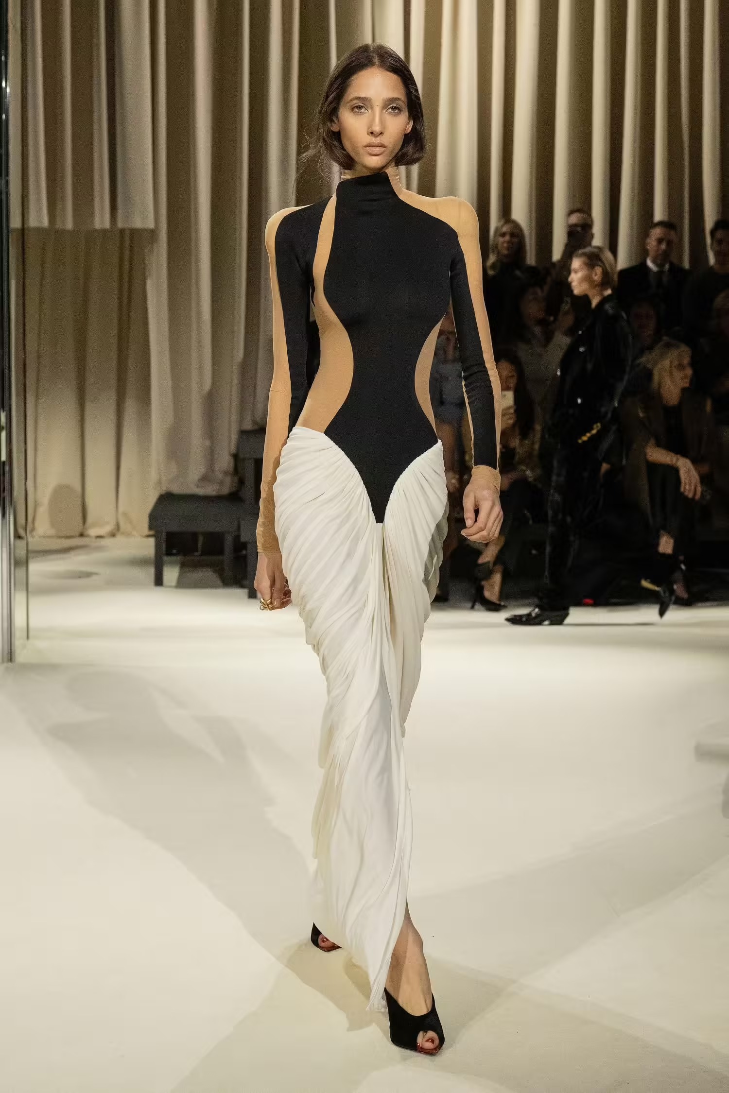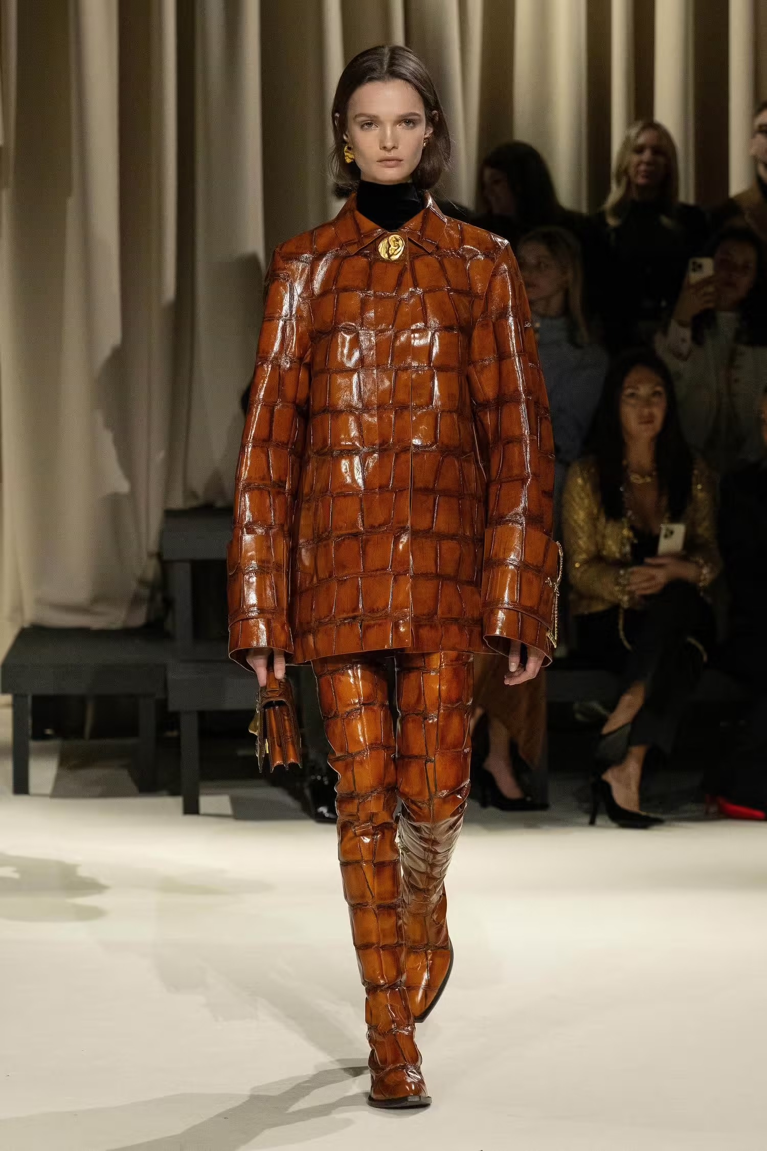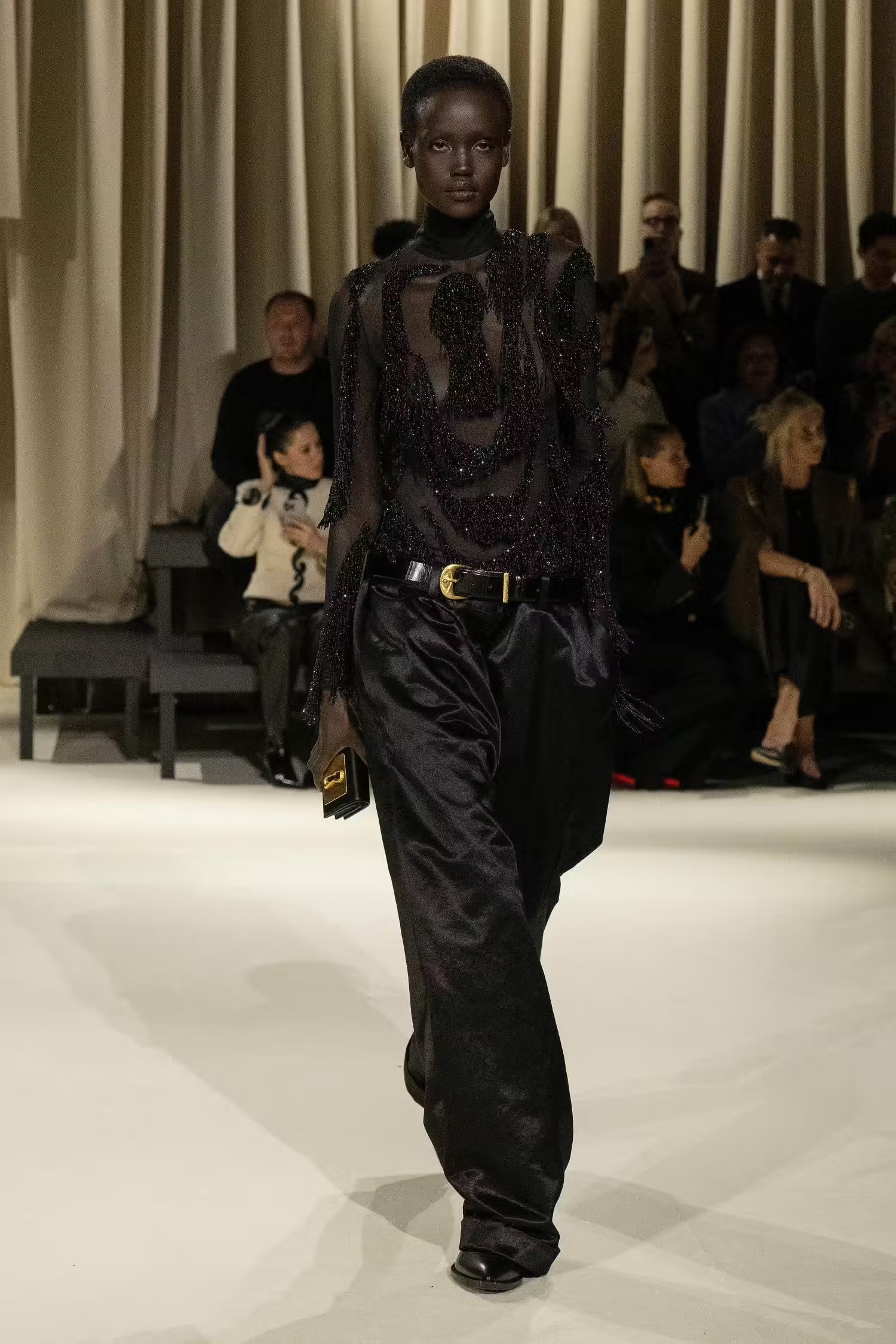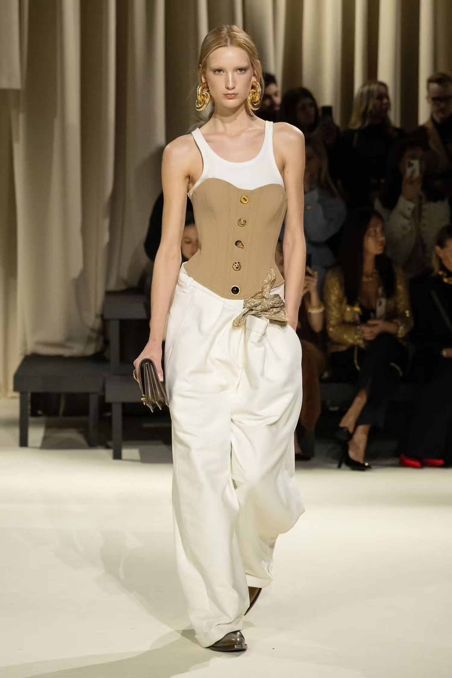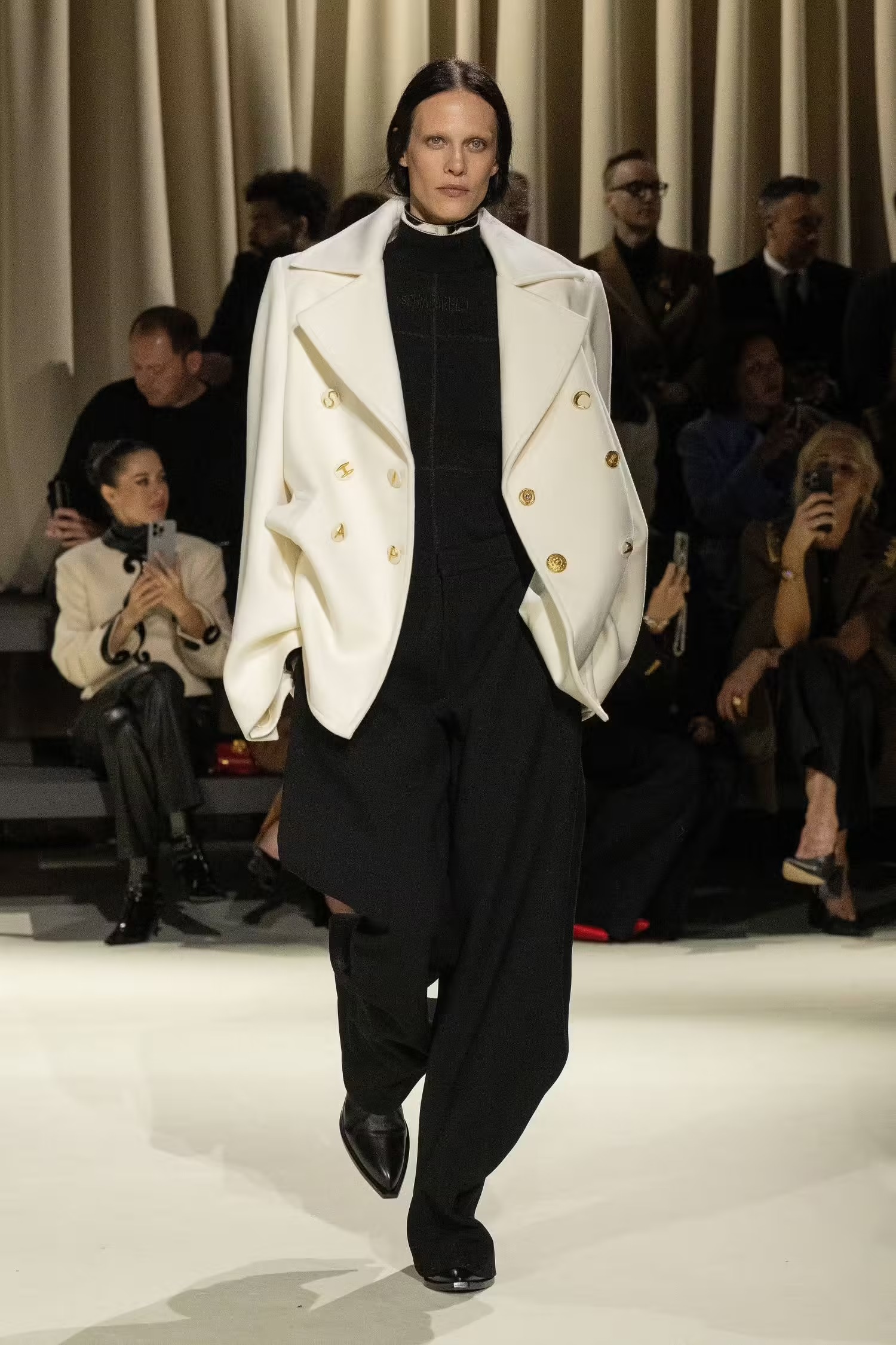 Ένας κορσές συνδυάστηκε με άνετο παντελόνι τοποθετώντας ένα μαντίλι σαν ζώνη, κάτι που δεν έχουμε ξαναδεί από τον Daniel Roseberry –καλλιτεχνικό διευθυντή του οίκου Schiaparelli- ο οποίος επιλέγει συνήθως λαμπερές τουαλέτες συνδυασμένες με υπερμεγέθη κοσμήματα και αξεσουάρ. Μιλώντας για λάμψη, από την FW2024-2025 συλλογή δεν έλειψαν και οι πιο φανταχτερές εμφανίσεις, οι χρυσές λεπτομέρειες και τα πρωτότυπα αξεσουάρ. Λόγου χάρη η Vittoria Ceretti η οποία έκλεισε το show με μία αστραφτερή τουαλέτα σε μπεζ και μαύρες αποχρώσεις μαγνητίζοντας όλα τα βλέμματα.