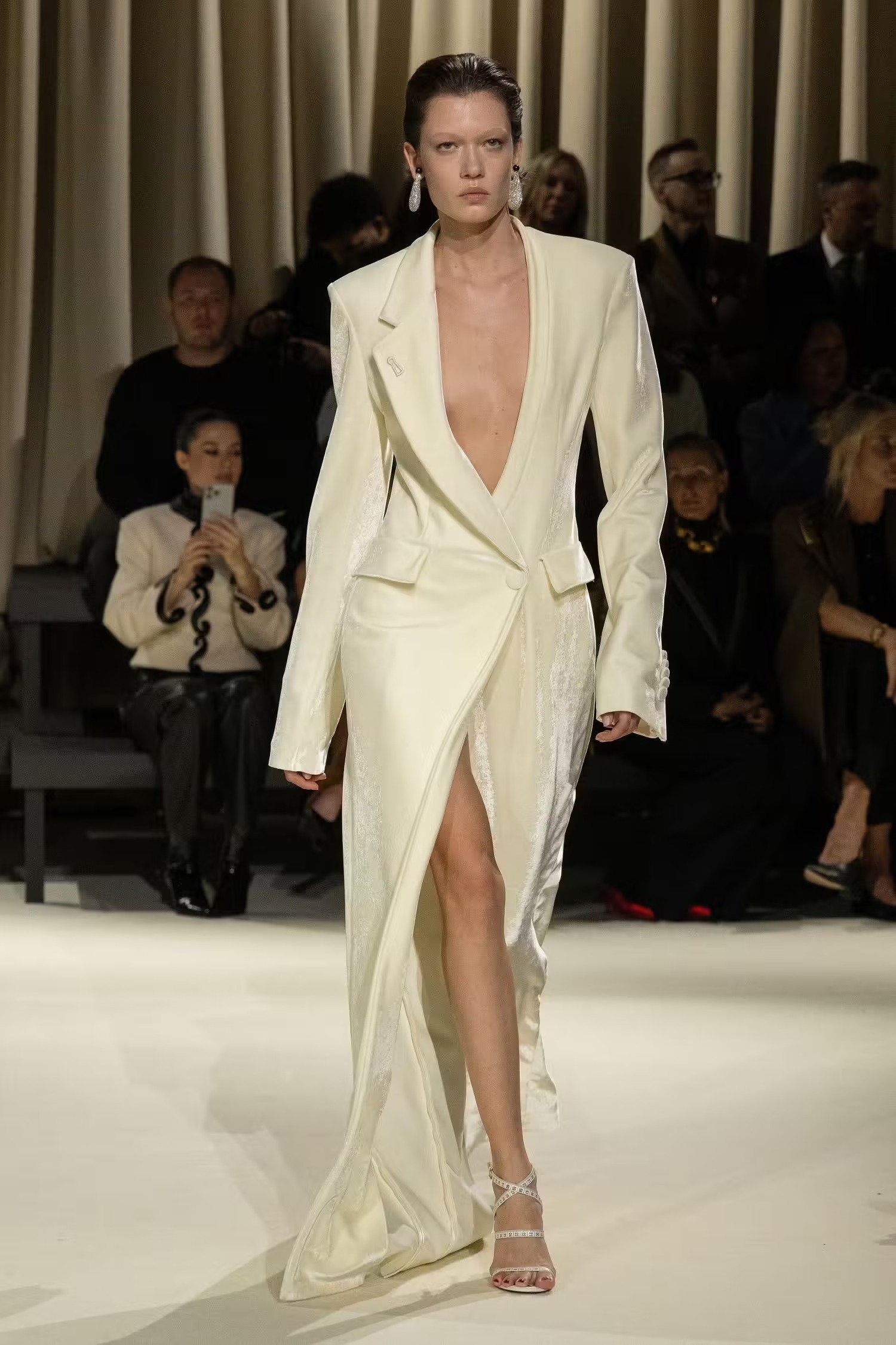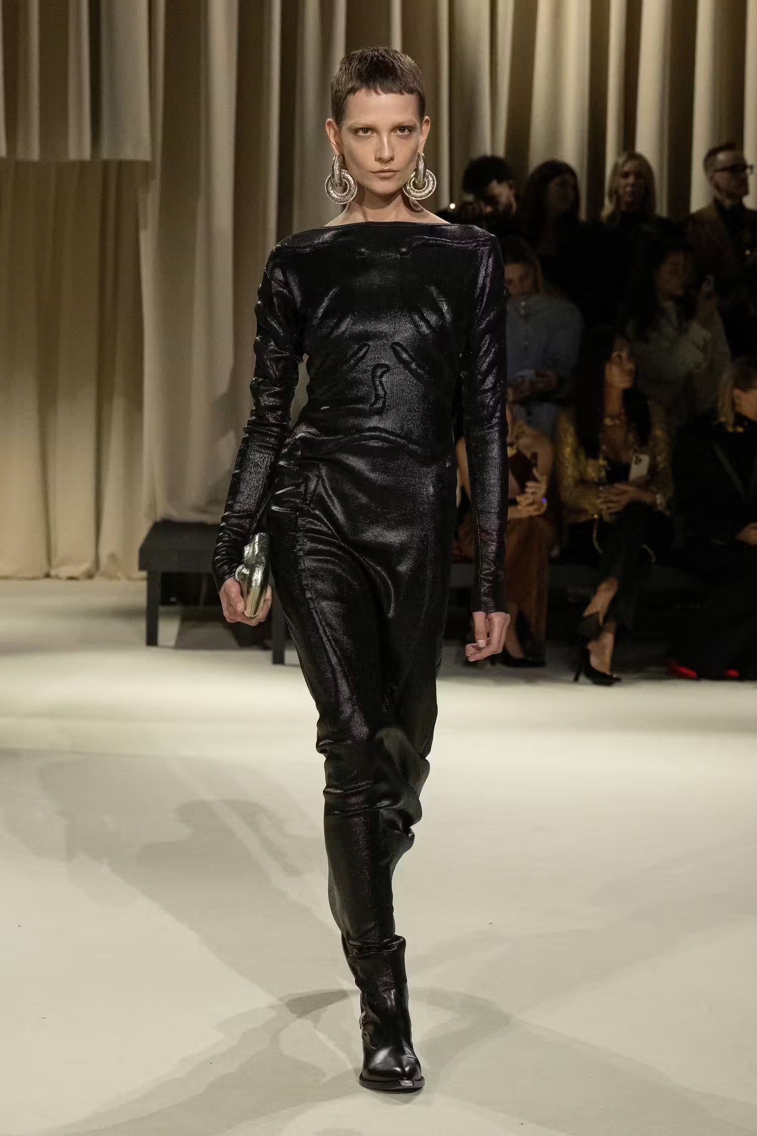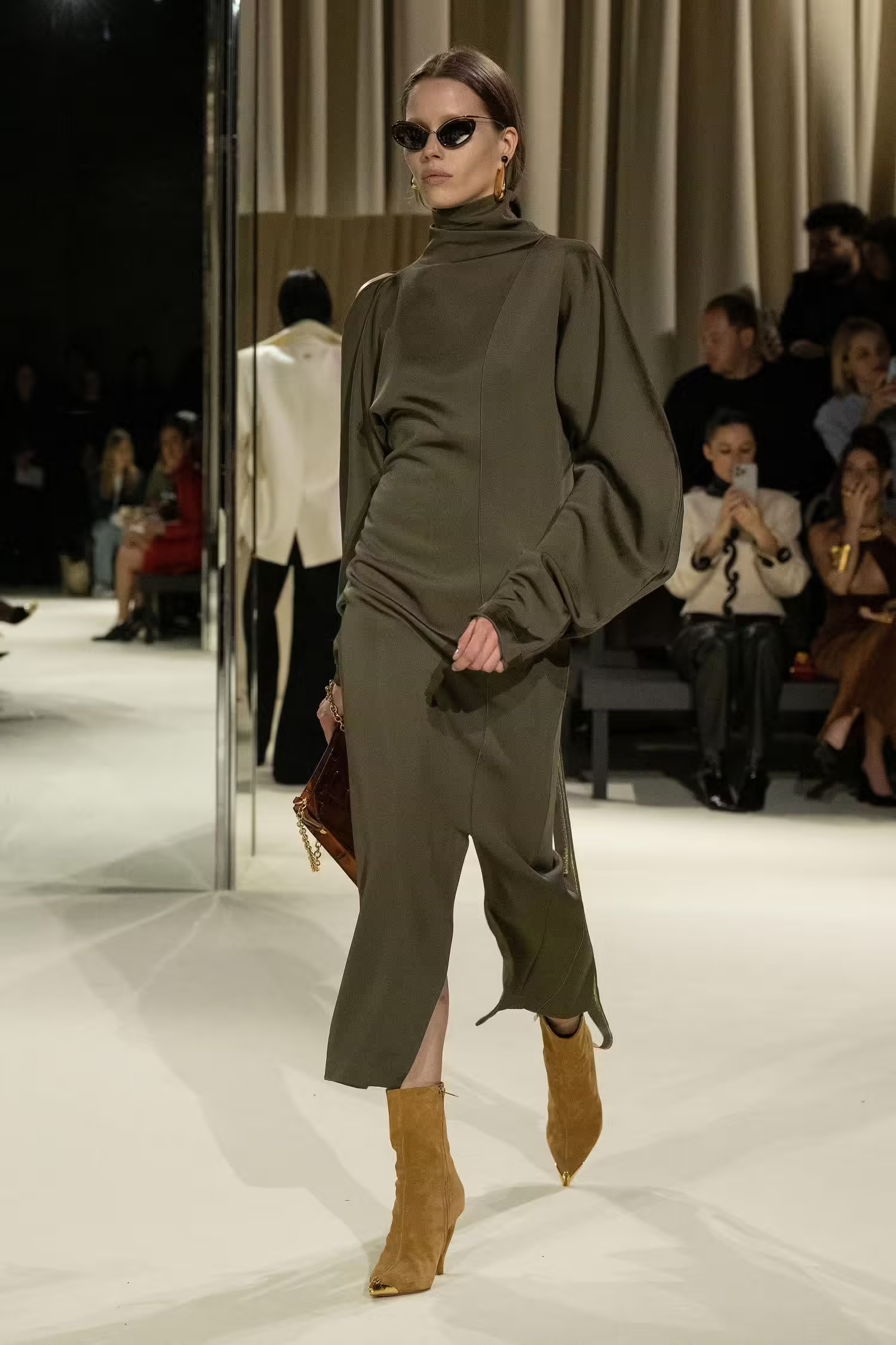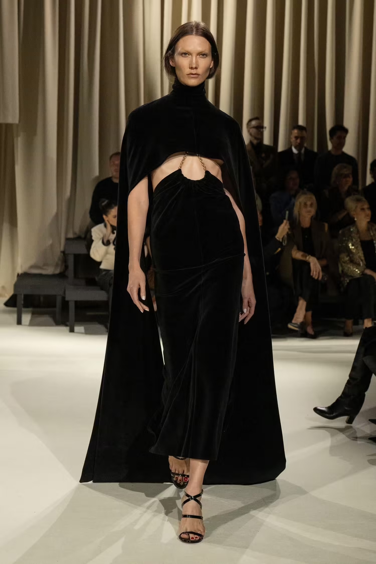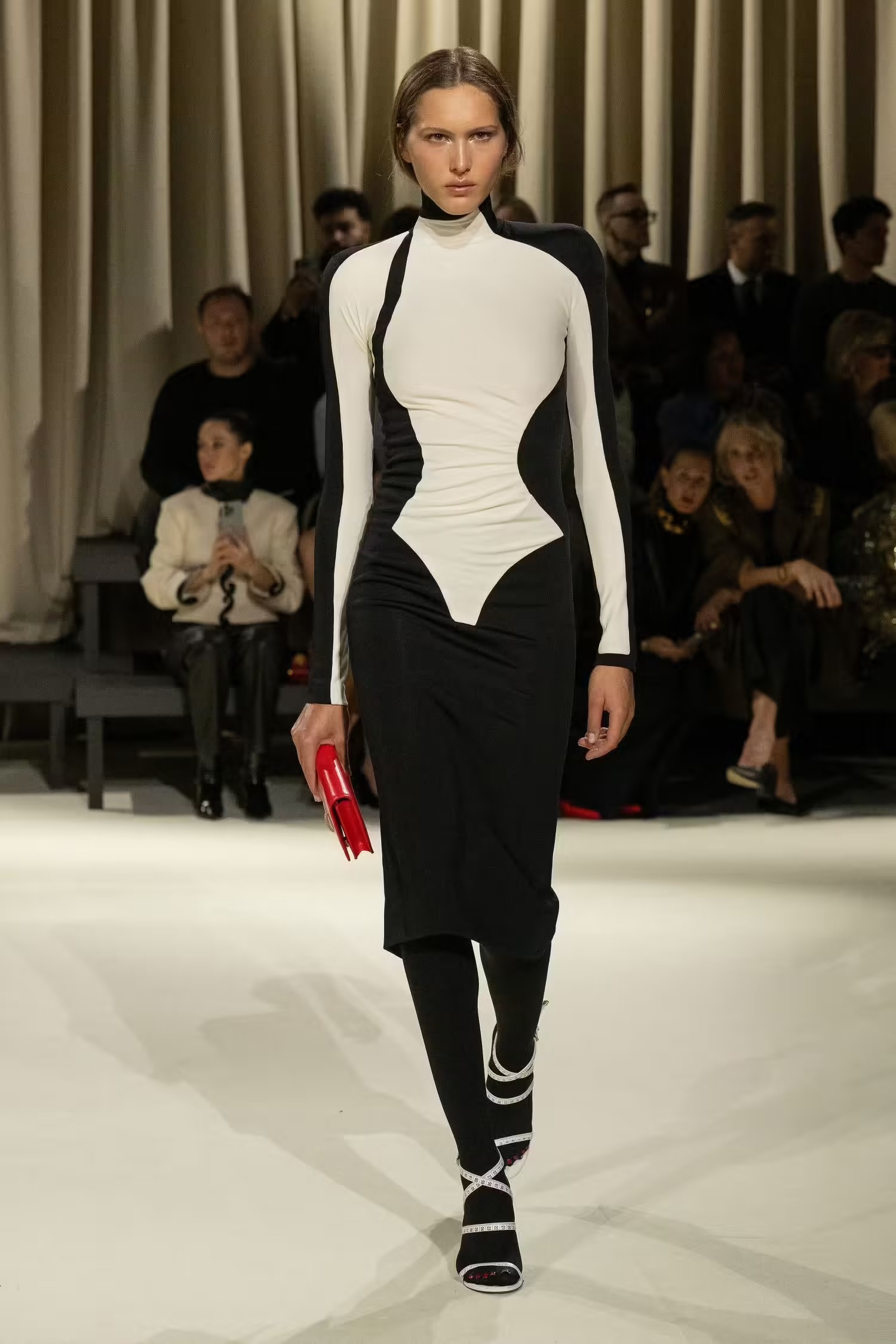 Ένας κορσές συνδυάστηκε με άνετο παντελόνι τοποθετώντας ένα μαντίλι σαν ζώνη, κάτι που δεν έχουμε ξαναδεί από τον Daniel Roseberry –καλλιτεχνικό διευθυντή του οίκου Schiaparelli- ο οποίος επιλέγει συνήθως λαμπερές τουαλέτες συνδυασμένες με υπερμεγέθη κοσμήματα και αξεσουάρ. Μιλώντας για λάμψη, από την FW2024-2025 συλλογή δεν έλειψαν και οι πιο φανταχτερές εμφανίσεις, οι χρυσές λεπτομέρειες και τα πρωτότυπα αξεσουάρ. Λόγου χάρη η Vittoria Ceretti η οποία έκλεισε το show με μία αστραφτερή τουαλέτα σε μπεζ και μαύρες αποχρώσεις μαγνητίζοντας όλα τα βλέμματα.
