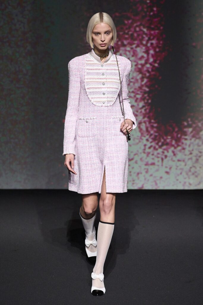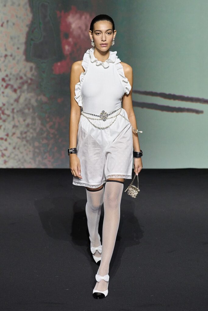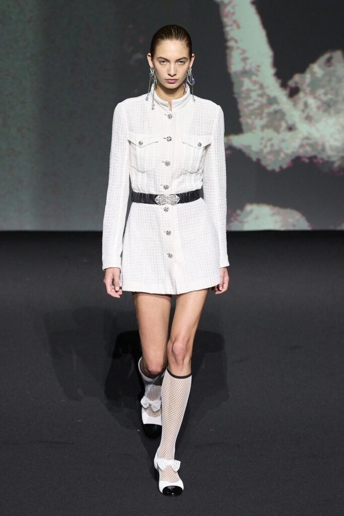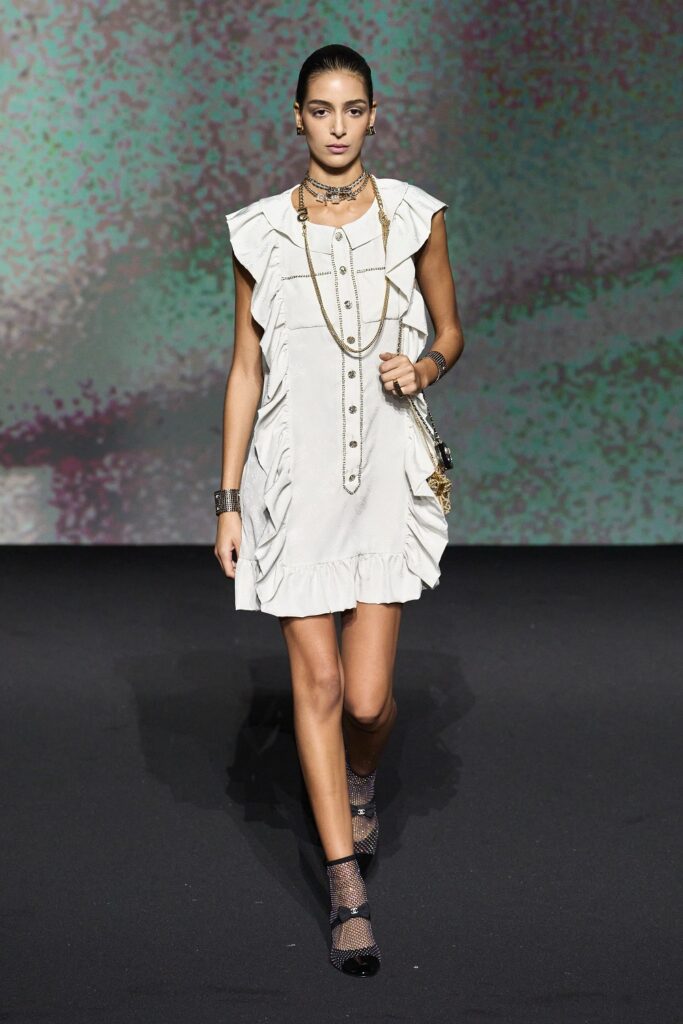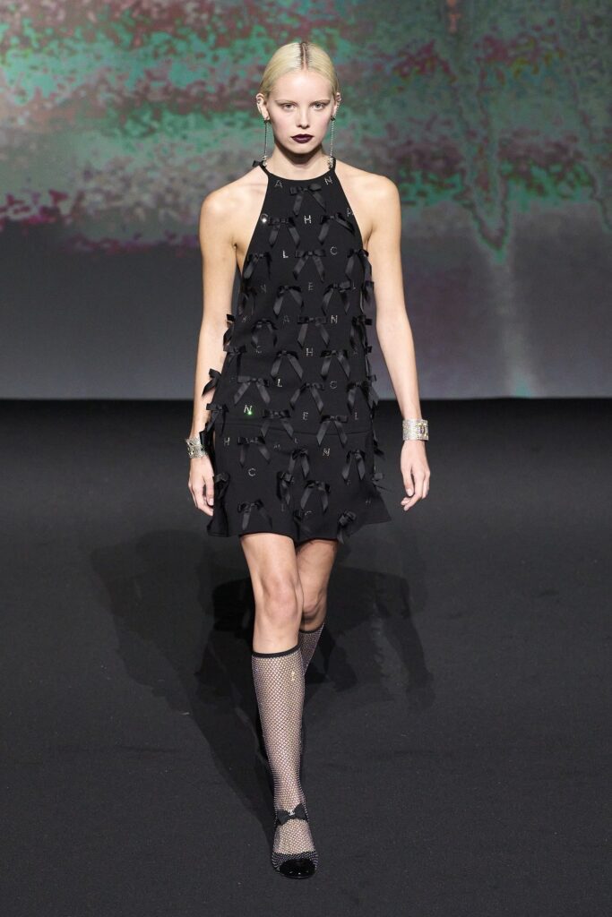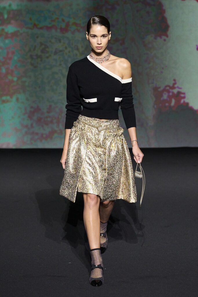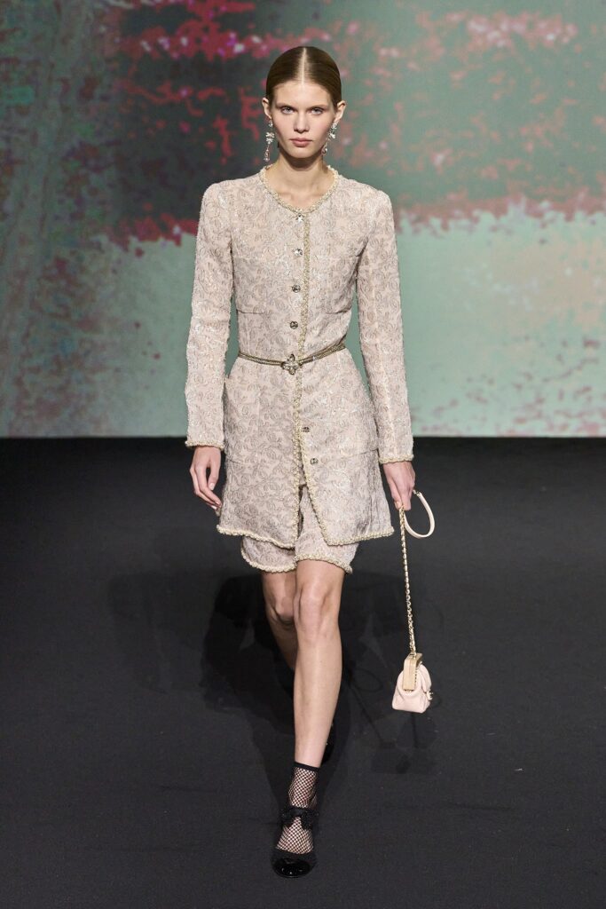 Αν κάτι ξεχωρίζει αυτή την άνοιξη του 2023, είναι η εκδοχή της Viard στην τάση logomania. Η πρότασή της το προσεγγίζει από μια πολύ, πολύ διακριτική οπτική: κοστούμια με χρυσές λάμψεις που ενσωματώνουν κύκλους με το διπλό C, μαύρα φορέματα στα οποία το logo φαίνεται μόνο στο φως ή μίνι φορέματα δεκαετίας του ’60 με φιόγκους ή τα γράμματα του οίκου στο ύφασμα. Ακολουθώντας τους κώδικες της Chanel, η καμέλια είναι ένα άλλο από τα μοτίβα που υπάρχουν στη συλλογή: ένα ασπρόμαυρο σακάκι με λουλούδια και σατέν πέτο ή ένα λουλούδι σε φορέματα από διαφορετικά υφάσματα.